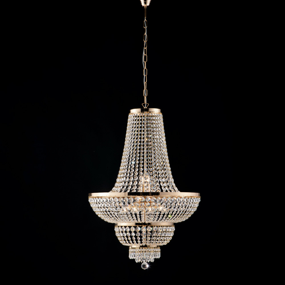 Denne lysekrone fås i en varm og overdådig poleret guldfinish eller en lysende og moderne poleret kromfinish og kombinerer italiensk håndværk med tidløs dekorativ stil. Perfekt til elegante stuer, spisestuer, dramatiske entréer, butikker og eksklusive kontorlokaler , og den bliver indretningens sande hovedperson.