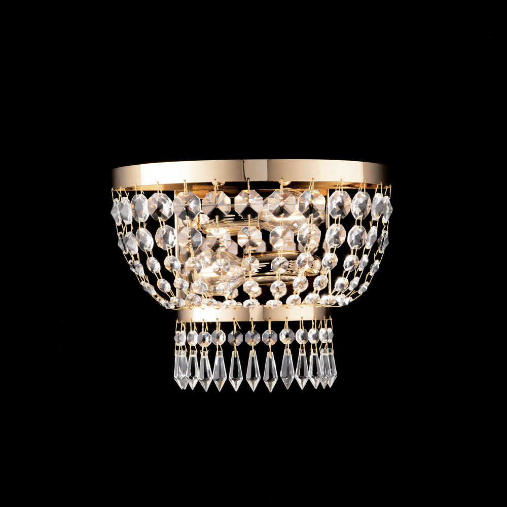 Denne væglampe fås i den varme og sofistikerede finish poleret guld eller den moderne og klare poleret krom og repræsenterer det ypperlige italienske håndværk , hvor kvalitetsmaterialer og sans for detaljer smelter sammen i et tidløst design.