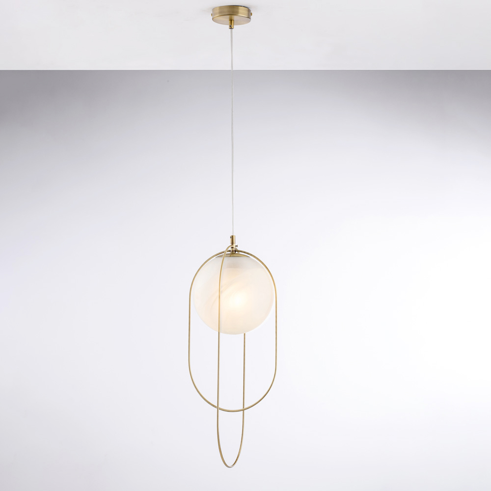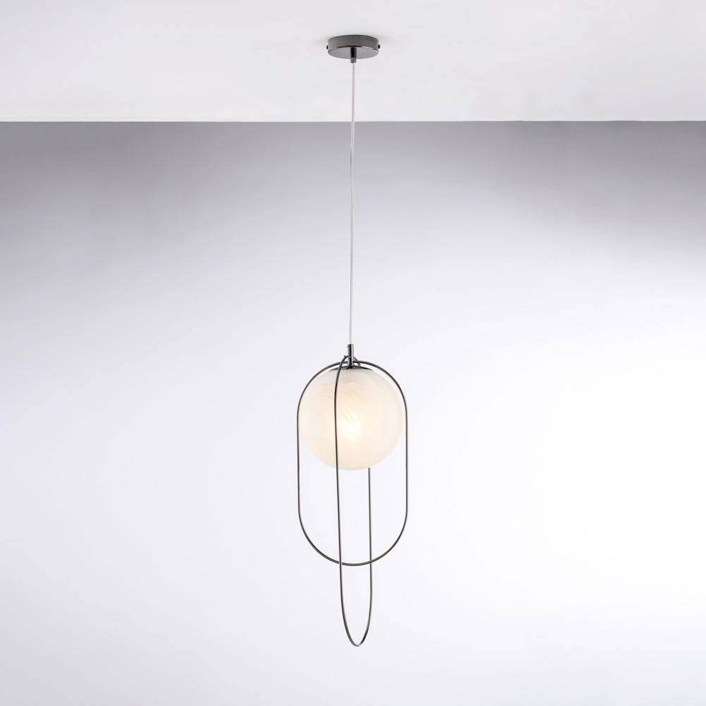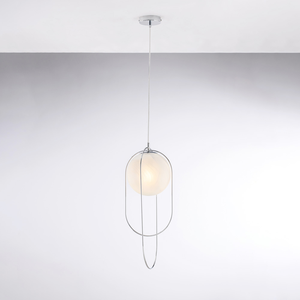 Denne designerpendellampe i jern med glaskugle er enkel og sofistikeret og er en moderne belysningsløsning, designet til dem, der værdsætter rene linjer og underspillet elegance. Den slanke metalstruktur rummer en lysende kugle med en diameter på 20 cm , hvilket skaber en raffineret balance mellem form og lys.
