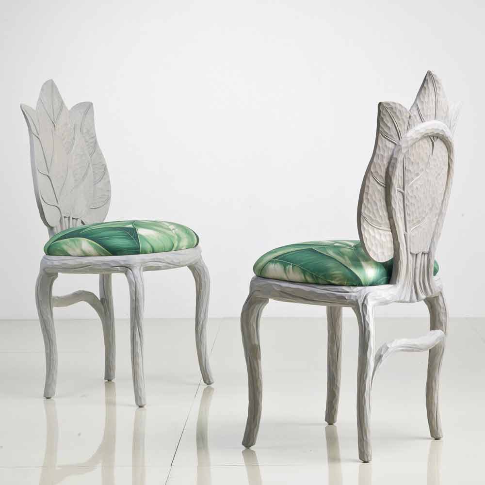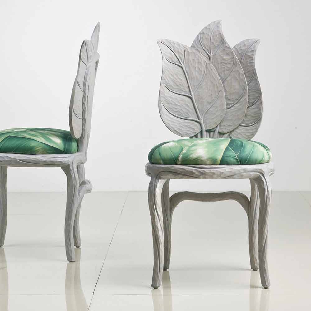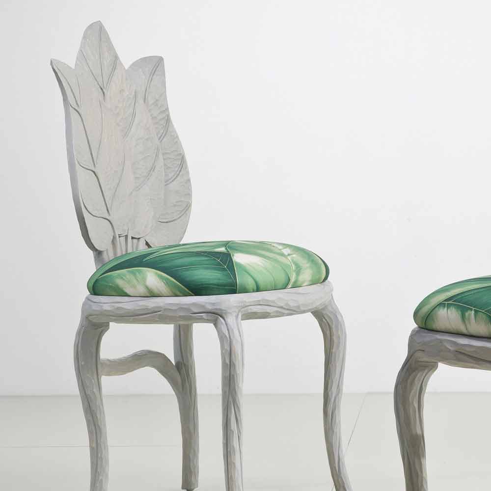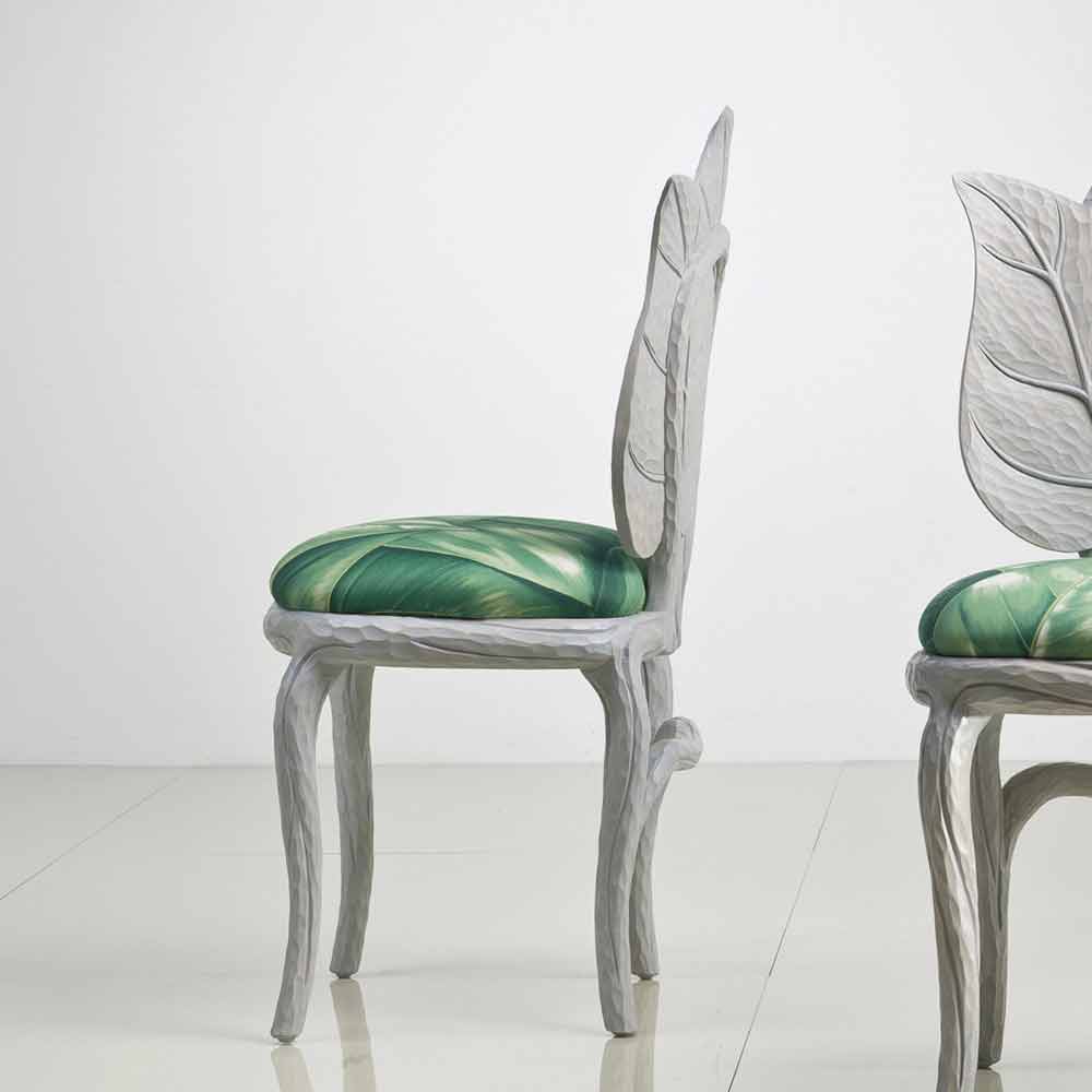 Spisebordsstol med ryglæn lavet af 3 blade udskårne, polstret sæde med brandhæmmende gummi. Massivt træ struktur gengiver former af et bundt af blade udskåret i træet, og hvis ben er innerveret af tynde grene, af samme grund som optages af den dækkende stof af sædet, i en blanding af frisk løv og energiske nuancer. røg grå finish.