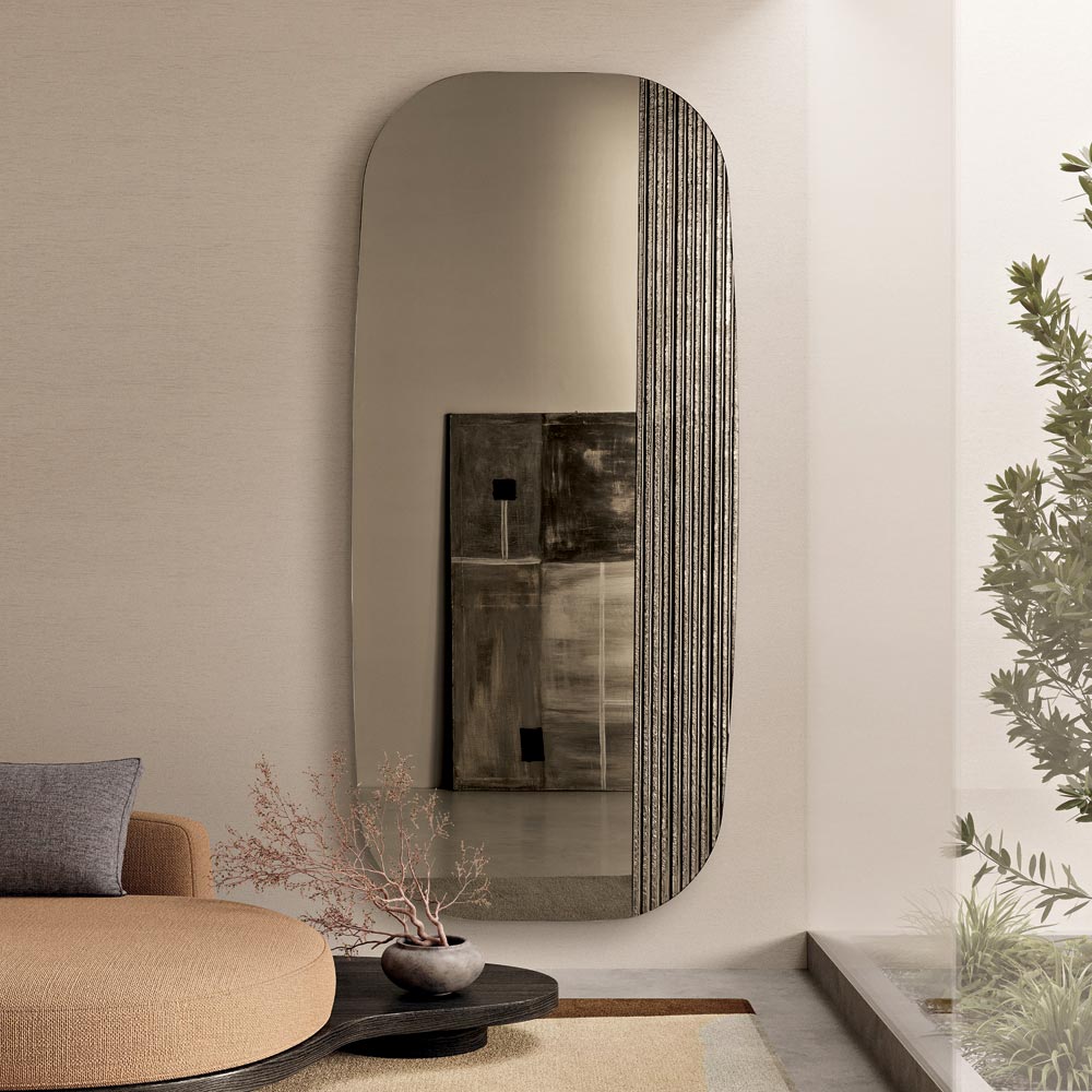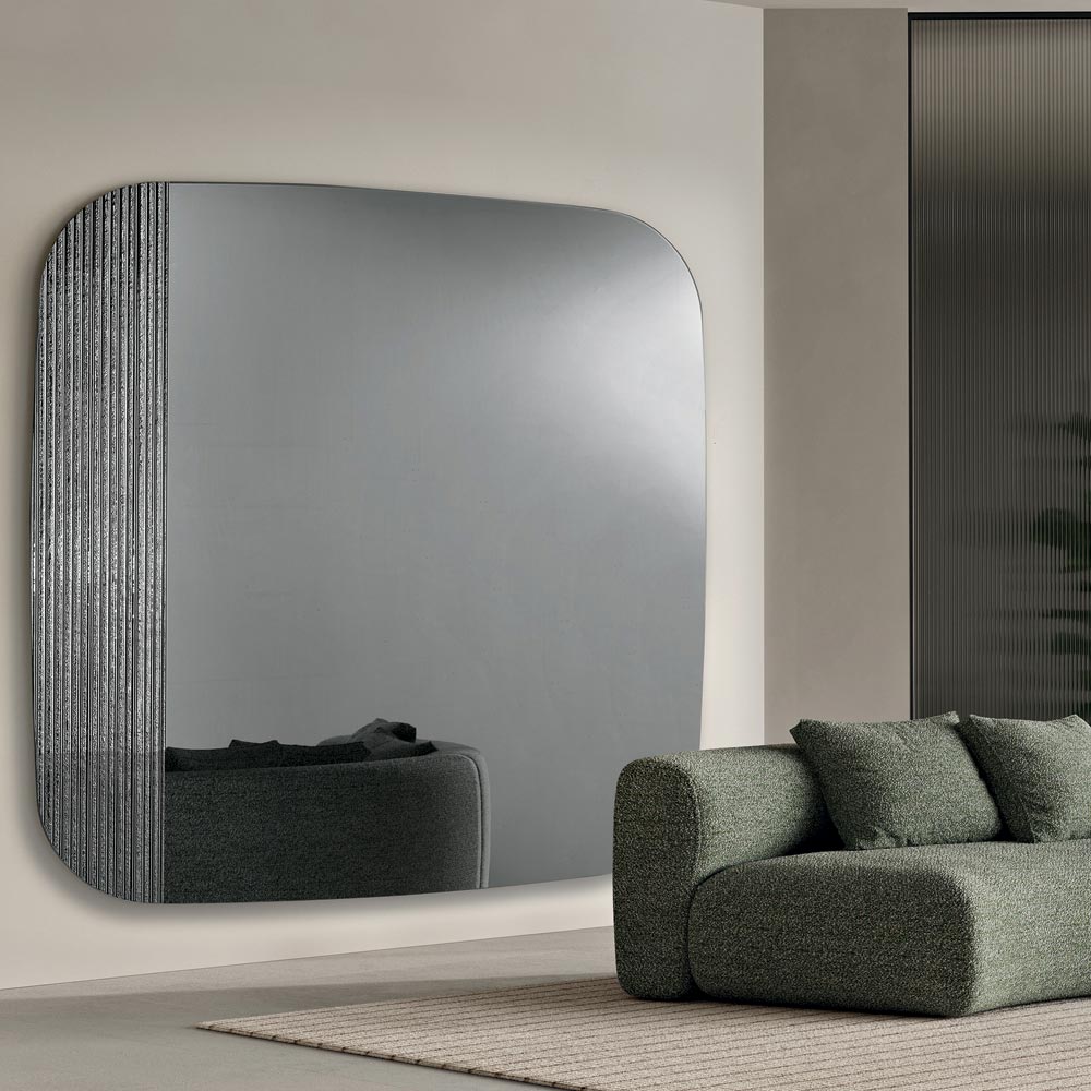 Den reflekterende overflade har en kontureret form med let afrundede hjørner , der er designet til at skabe en blød og harmonisk visuel effekt. Designet er udsmykket med en tone-i-tone, forsølvet, rillet glasindsats , der tilføjer dybde og bevægelse og skaber et raffineret samspil mellem lys og tekstur på spejlets overflade.