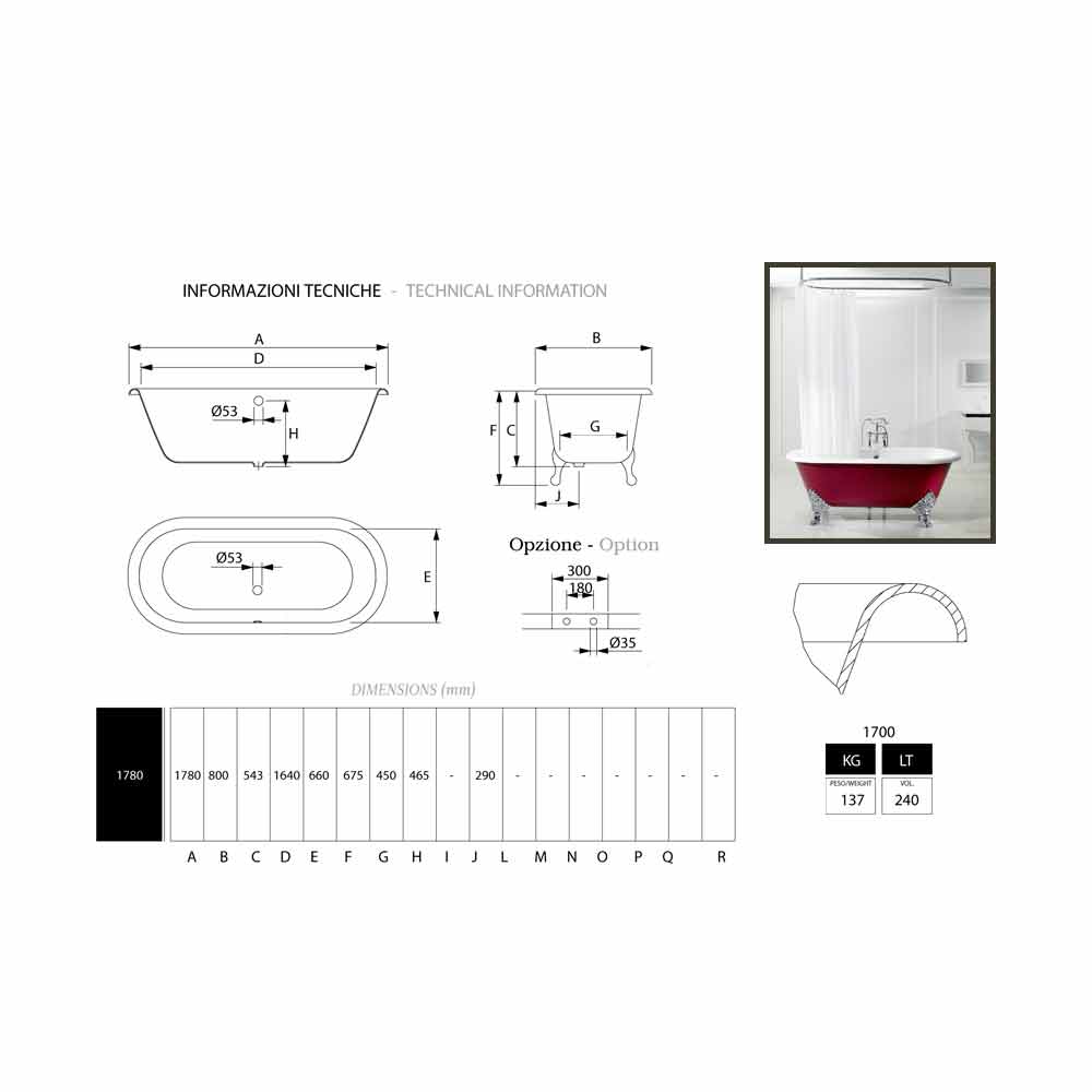 Fritstående badekar udelukkende lavet af støbejern. Indvendig 2 mm titanium emaljeret finish og udvendig malet finish i forskellige kromatiske variationer; komplet med støbejernsfødder også dekoreret og farvet. Badekar, der repræsenterer toppen af luksus!