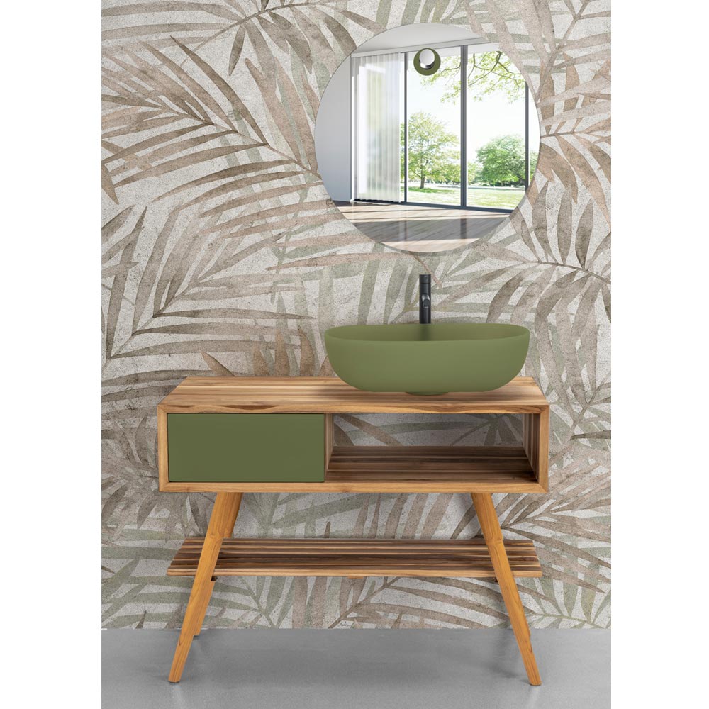 Gulvstående badeværelsesskab med struktur lavet af genbrugt naturligt teaktræ med sideskuffe i grønt mahognitræ , en nuance, der minder om Østen i alle detaljer. En bevidst grafisk æstetik forbedret endnu mere af de praktiske dimensioner, som gør den perfekt til at indrette små rum, der har brug for en elegant og funktionel hovedperson.