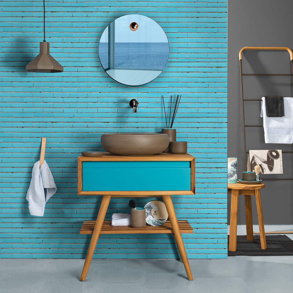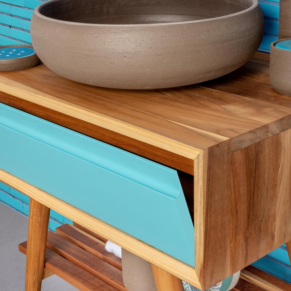 Gulvstående badeværelsesskab lavet af naturligt genvundet teaktræ med klapskuffe i blåt mahognitræ , en farve, der refererer til den ro og sindsro, der er forbundet med naturlige elementer som vand og luft, der giver afslappende effekter, følelser, der refererer til charme, der overbærer naturen. Dens struktur er kendetegnet ved enkle former og praktiske rum, der er ideelle til at organisere badeværelsesområdet på en elegant og funktionel måde for et originalt resultat med en stærk moderne personlighed .