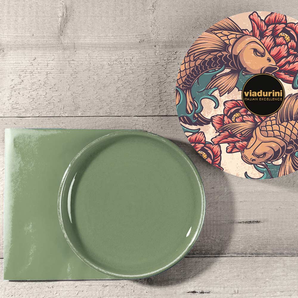 , håndlavet i Italien, emaljeret indvendigt med en grøn finish, en farve, der minder om foråret og planternes blomstring og bringer tilbage til den oprindelige kontakt med naturen. Hvert element i sammensætningen er kendetegnet ved særlige detaljer såsom
