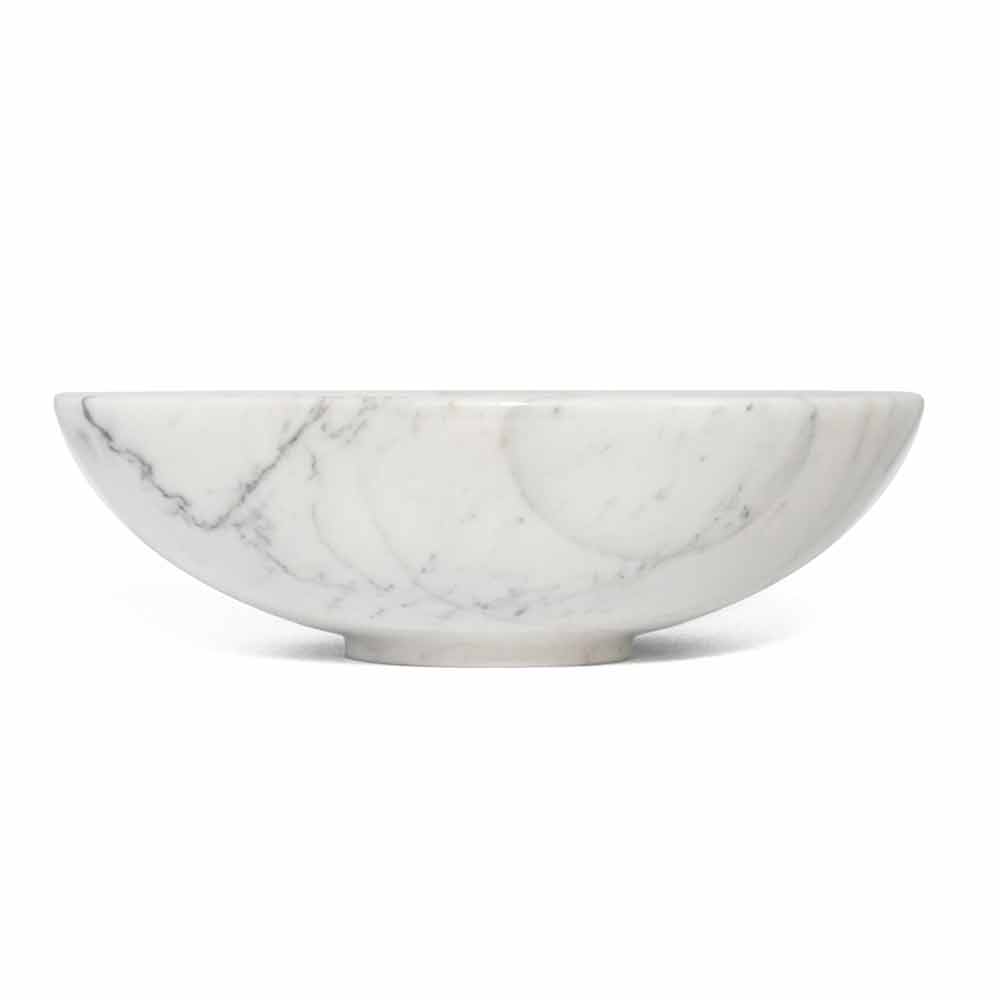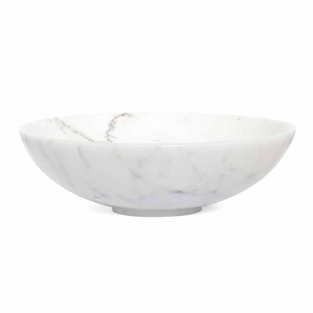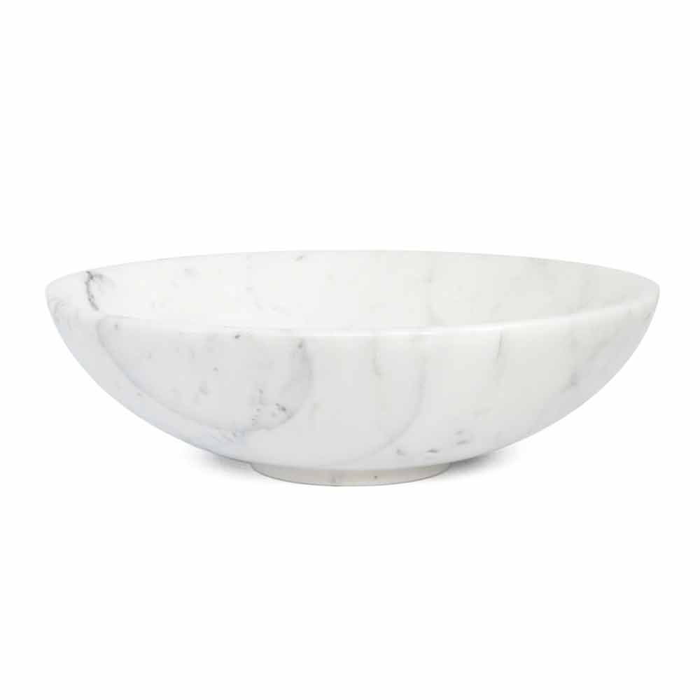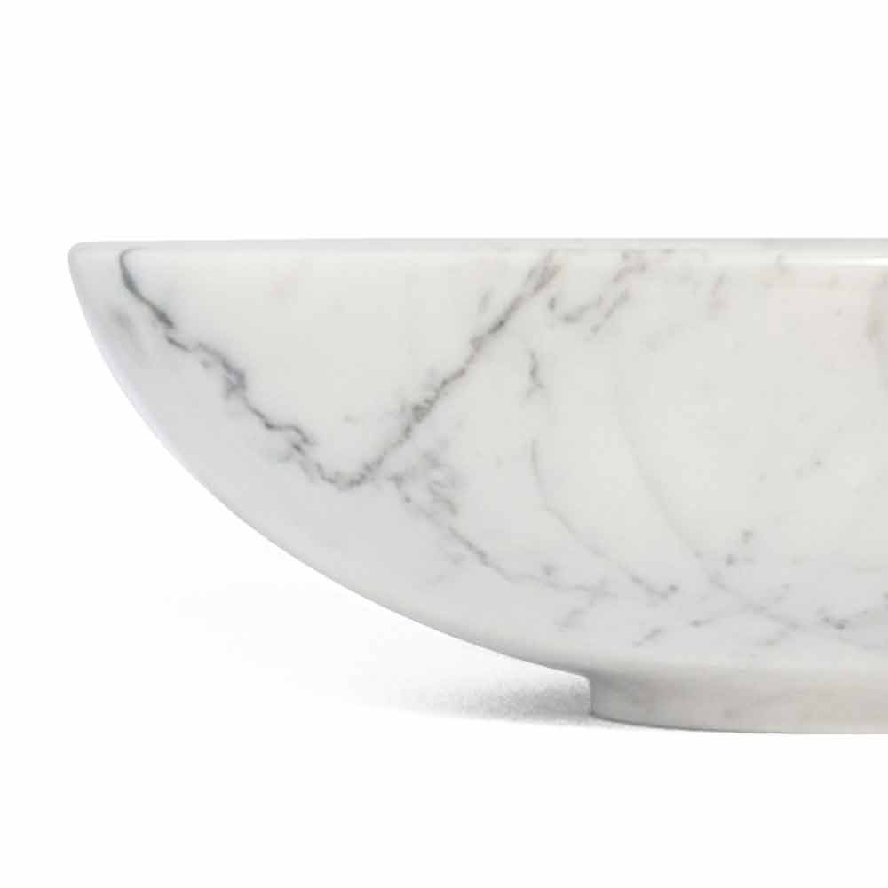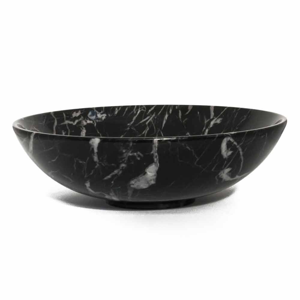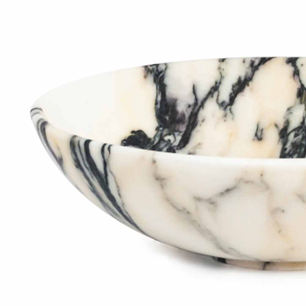 Rund frugtskål præget af ædel marmor, som den er håndlavet af specialiserede fagfolk. Det er et unikt stykke, da hver brugt marmorblok adskiller sig fra de andre for vener og nuancer.