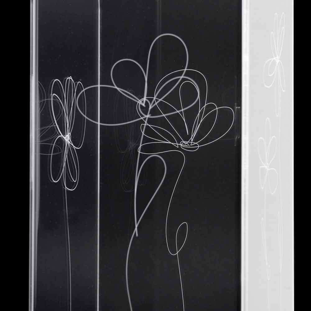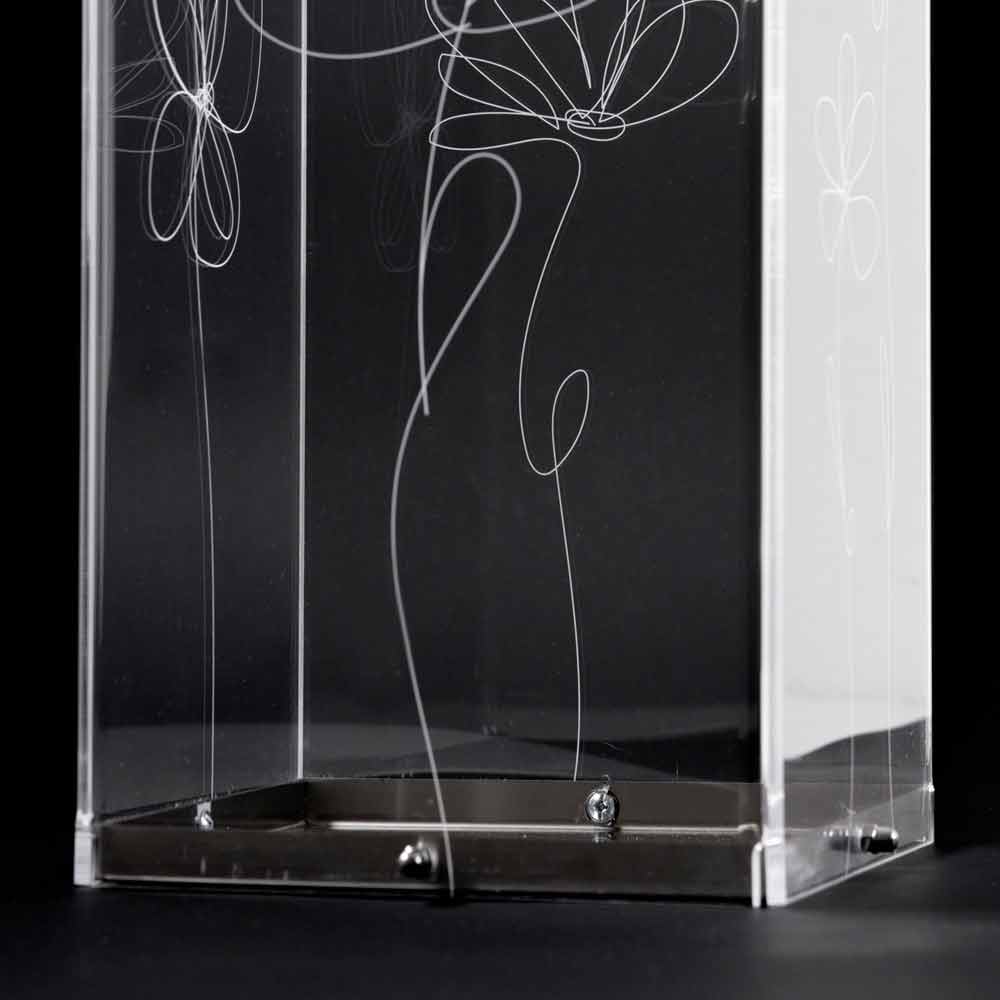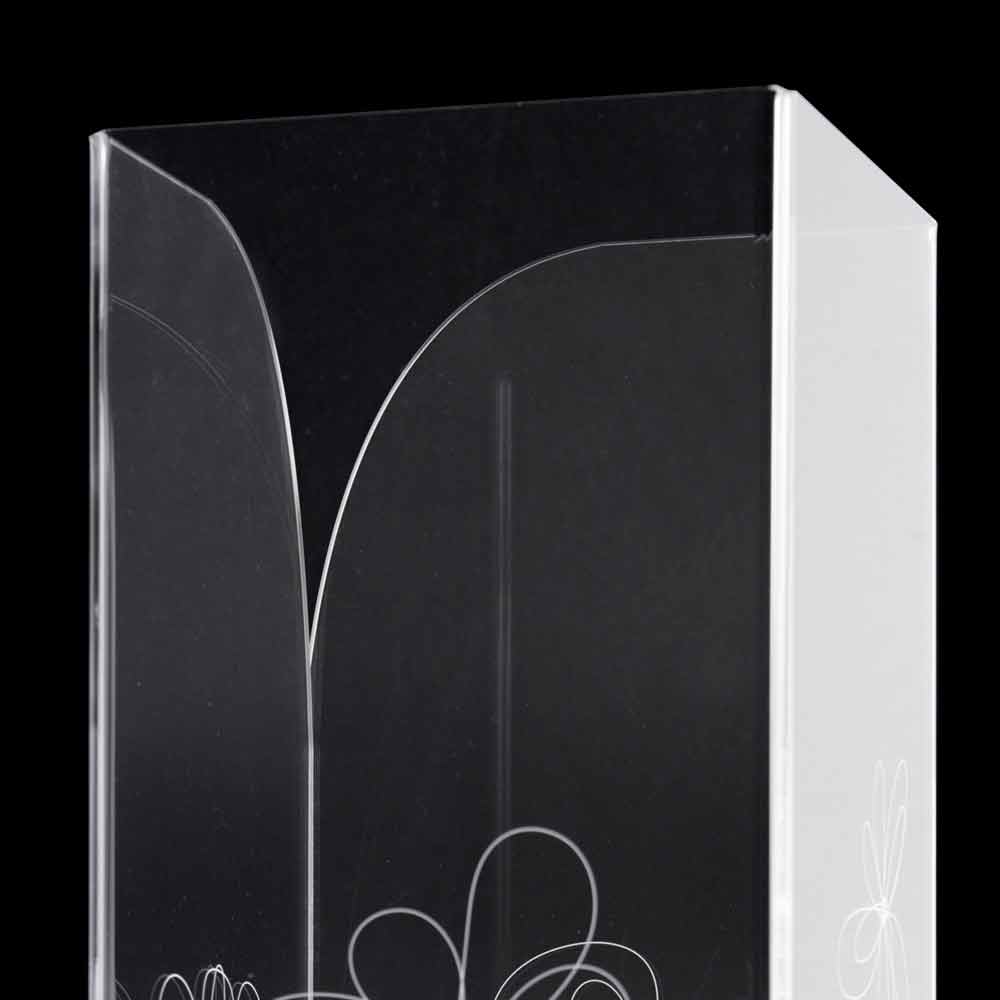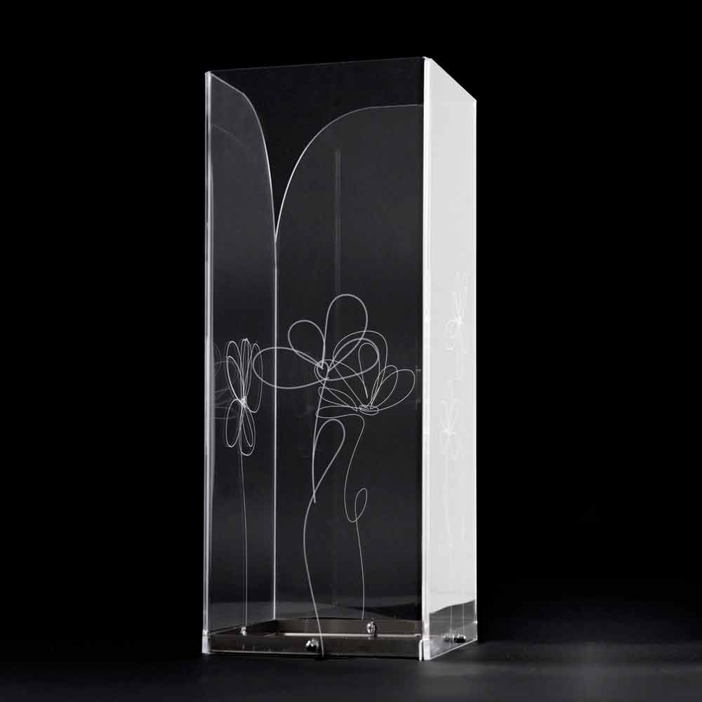 Paraplystativ i gennemsigtigt plexiglas, der er kendetegnet ved lasermærkede blomsterdekorationer i en stiliseret stil med rustfri stålbase.