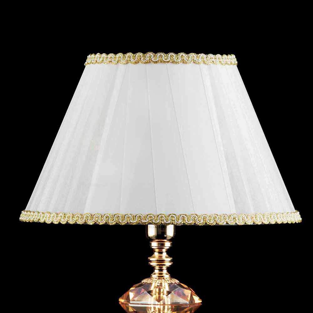 Klassisk designlampe i ravglas og krystal, guldfinish. Organza og pongè lampeskærm.