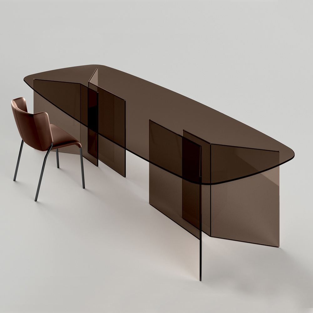 Spisebord udelukkende lavet af ultra-resistent glas med en formet rektangulær plade. Et supplement med en raffineret karakter, der kommer fra en 100% Made in Italy produktionsproces takket være dygtige håndværkere, eksperter i glasforarbejdning, et enkelt materiale, der giver liv til et kostbart designbord.