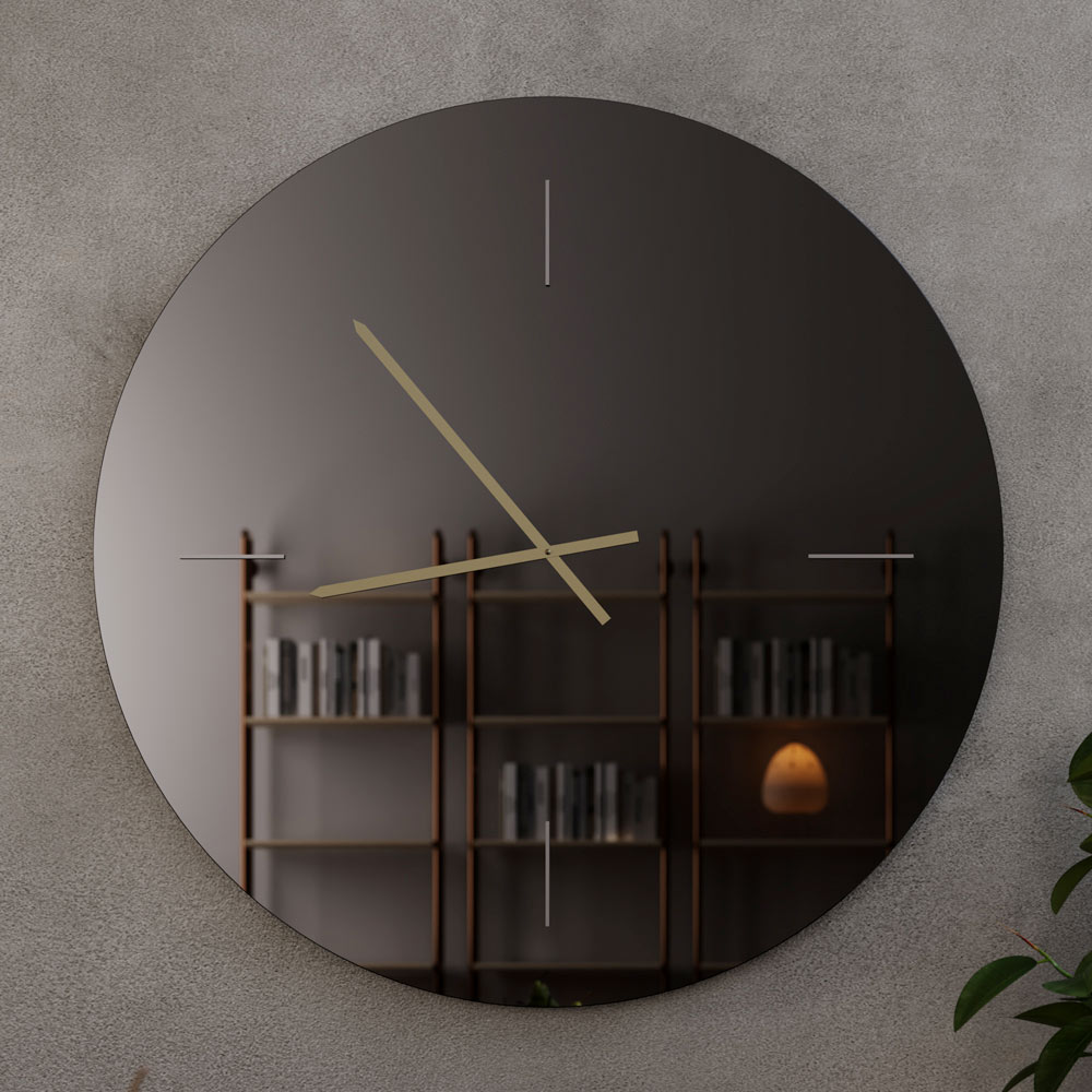 Væguret i røgfarvet glas er et moderne og sofistikeret designtilbehør, perfekt til moderne og elegante rum. Urskiven i røgfarvet glas skaber en raffineret spejleffekt, der tilføjer visuel dybde og fremhæver væggen med subtile, stilfulde detaljer.