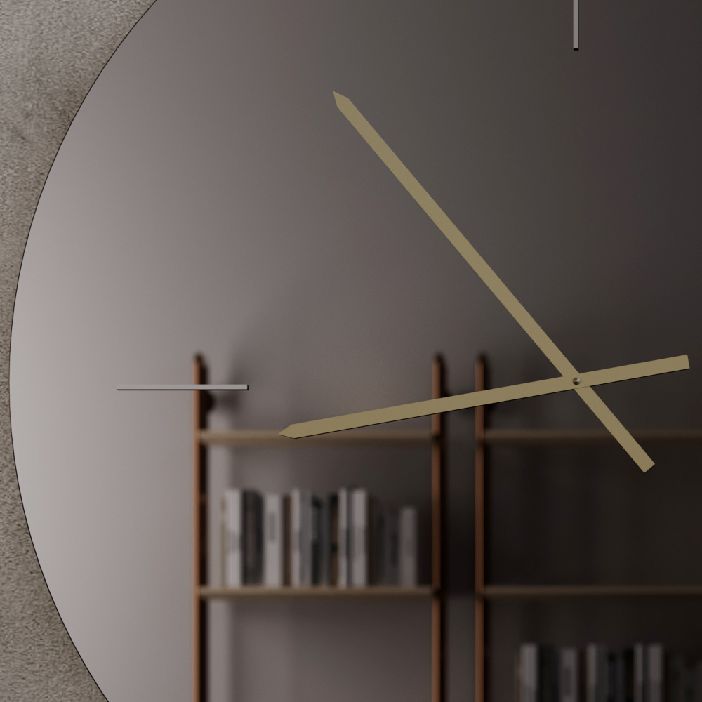 De tynde, essentielle messingvisere i satinfinish står elegant frem mod den røgede baggrund og skaber en raffineret og harmonisk kontrast. Det minimalistiske design, fri for overflødige elementer, gør dette ur til et sandt dekorativt objekt, der kan forbedre moderne stuer, spisestuer, direktionskontorer og arbejdsområder.