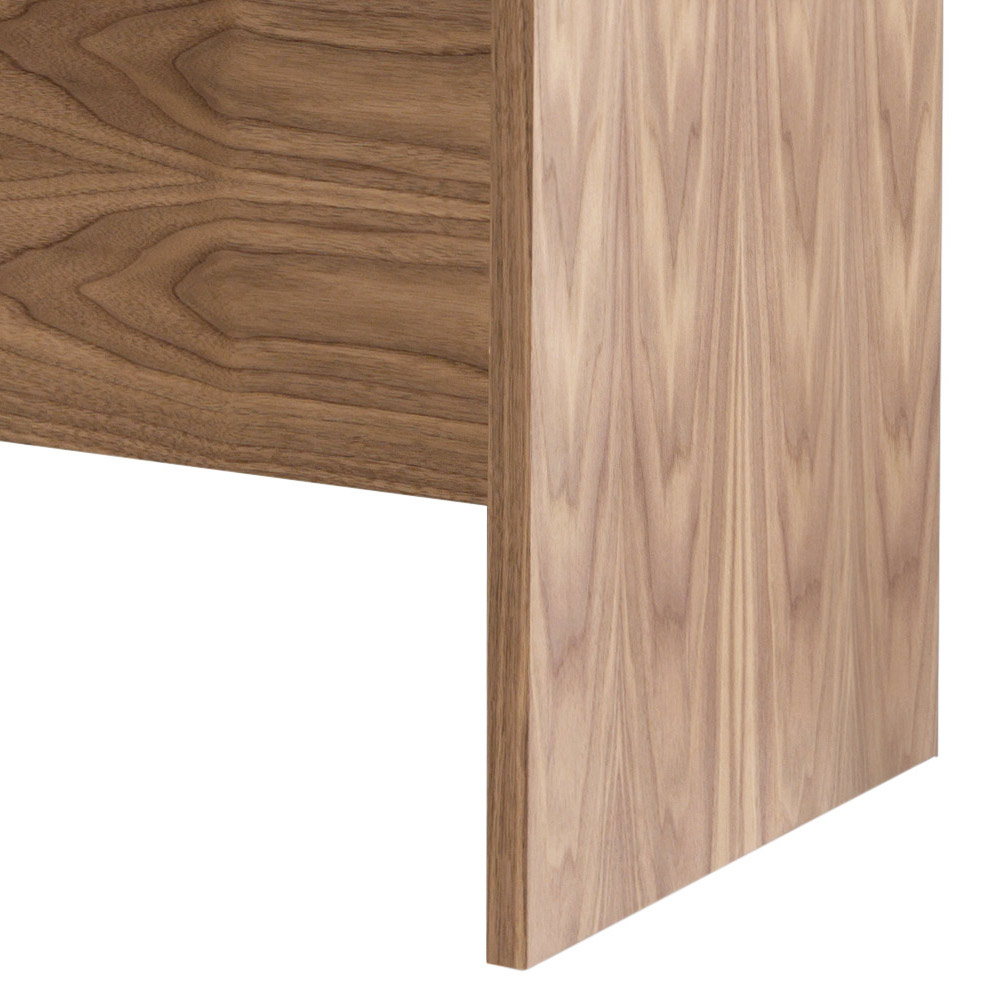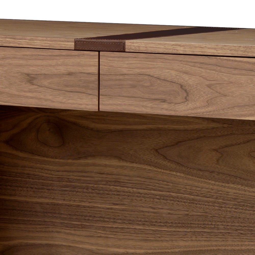 Lavet af buet krydsfiner fineret i canaletto valnød med frontal indlæg i naturligt læder.