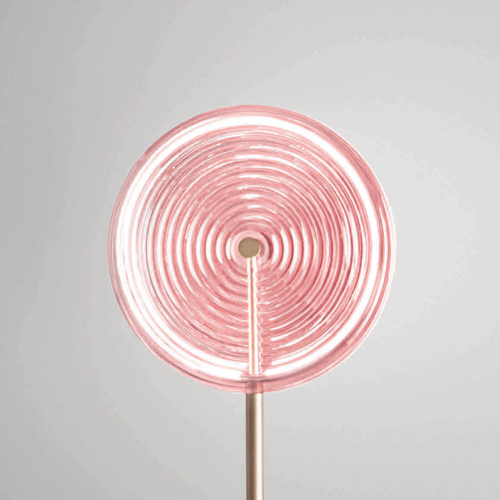 guldlakeret metal, glas dekoreret med lyserøde koncentriske linjer med