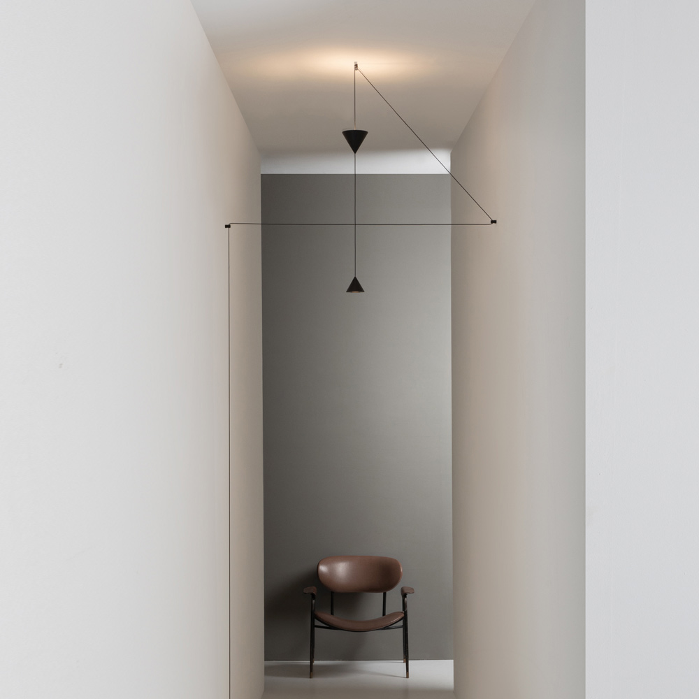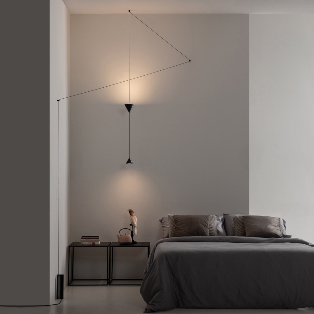 Rummet set som et hvidt ark er optaget af lampens tråd , der ligesom tegnene på en blyant sporer rummets linjer og omgivende genstande.