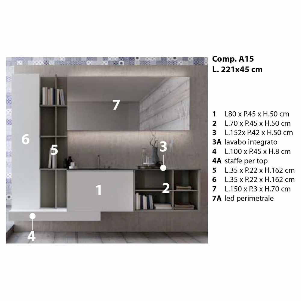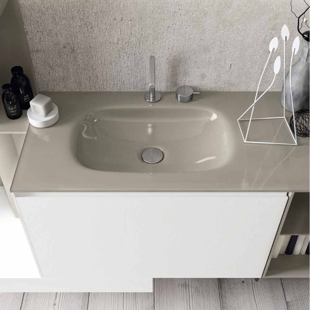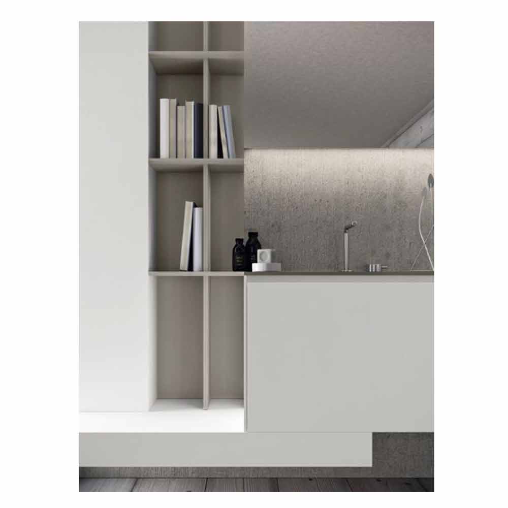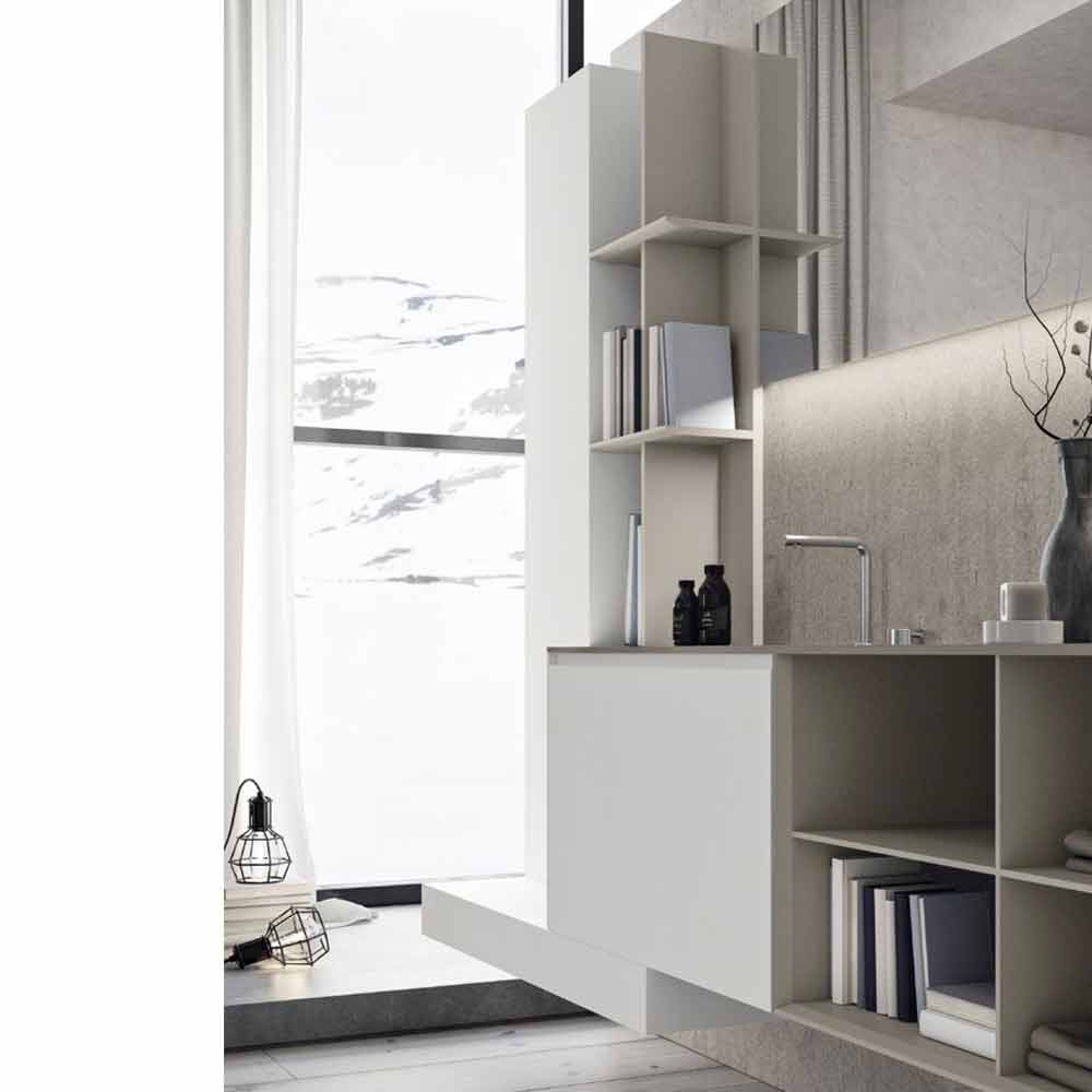 Moderne ophængt badeværelseskomposition, almindeligt design med åbne hylder, fremstillet i Italien