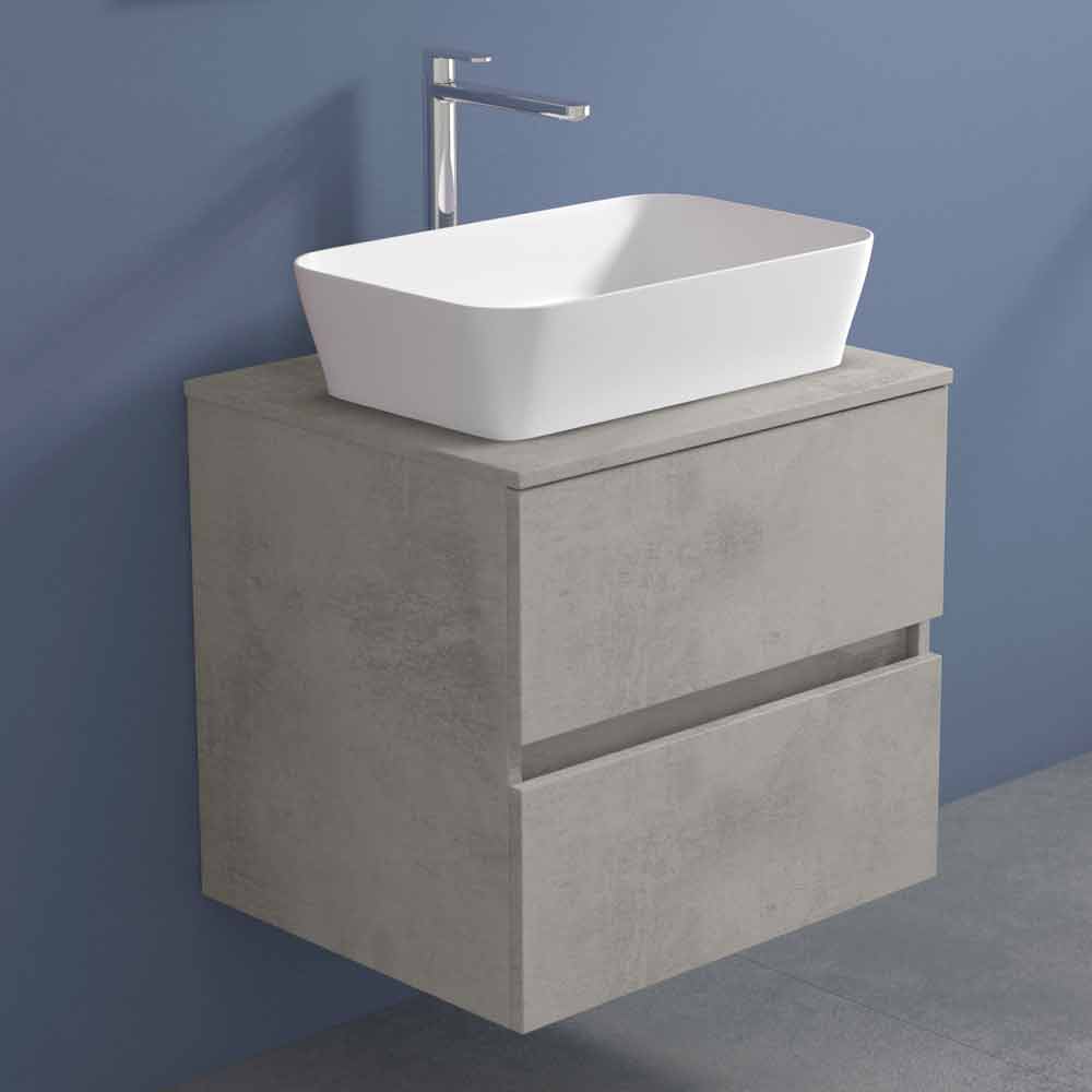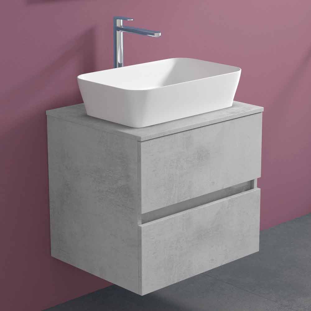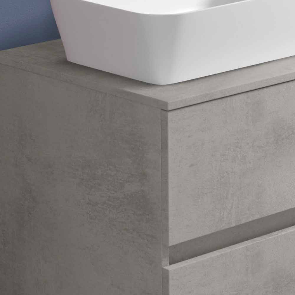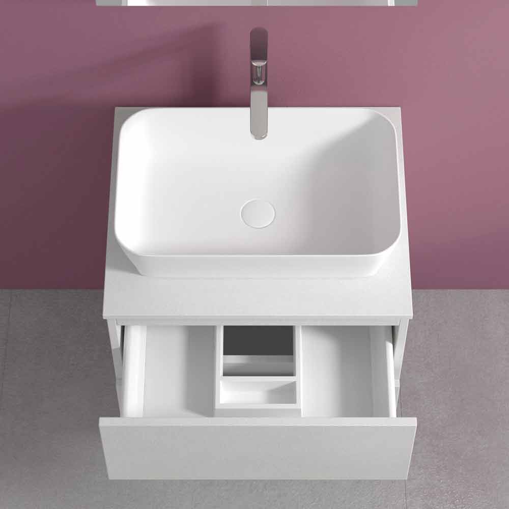 De hængende badeværelsesmøbler har et rent og minimalt design med en rektangulær håndvask til bordpladen for et moderne og tidløst resultat, der også lægger vægt på praktisk og funktionel.