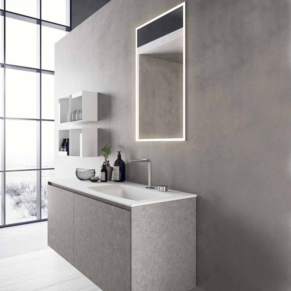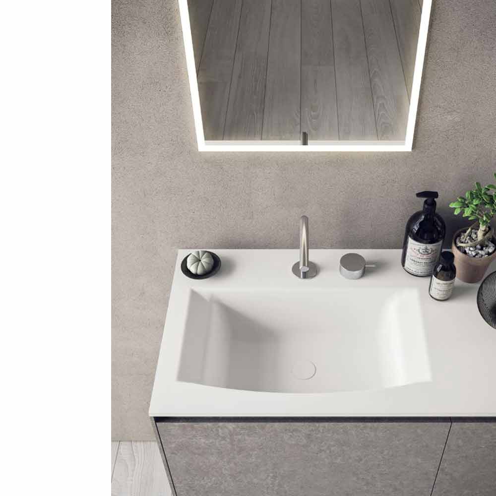 Denne formelle klarhed gives af rillelågen med en skråt profil og af det ultraminale rektangulære spejl med selvbelysningsramme.