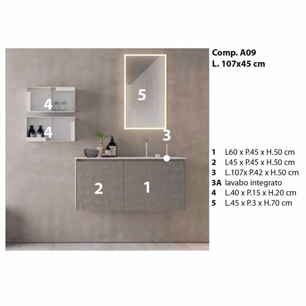 Denne kompositions ejendommelighed er givet af den indbyggede håndvask, der er kendetegnet ved to laterale sider, der forsigtigt falder ned mod bassinet.