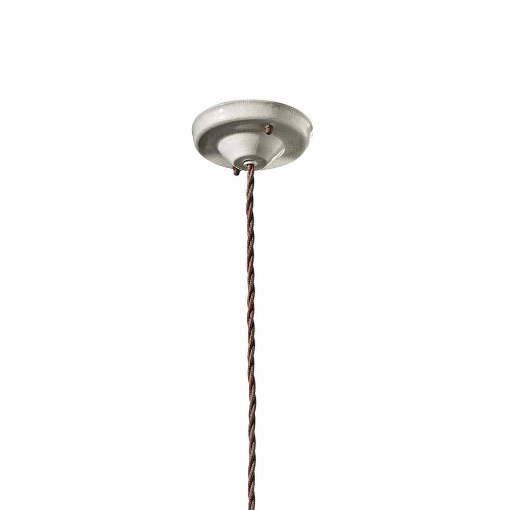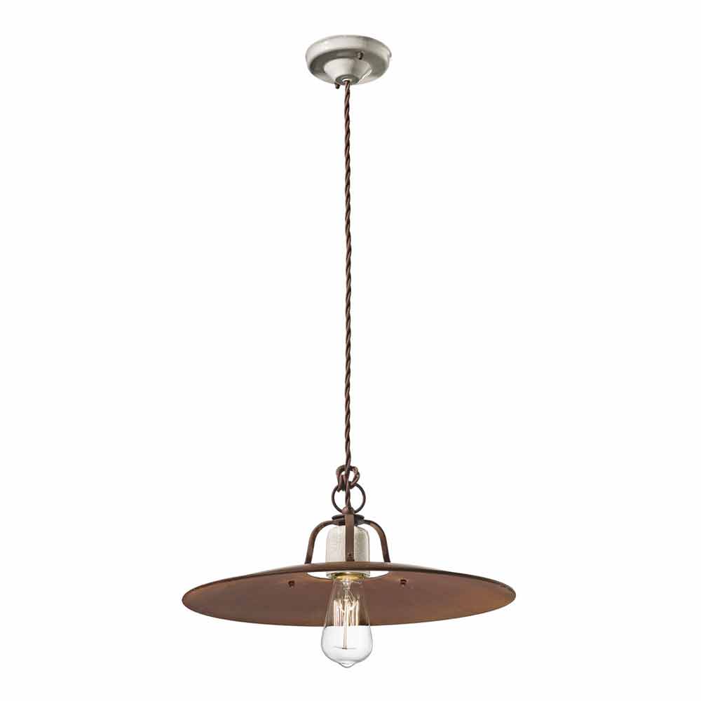 Bred krone og let justerbar højde takket være det flettede kabel, der fuldender den industrielle stil. Matt rust metal og keramiske detaljer for at fuldende en balance mellem fulde og tomme former. Den er inspireret af den amerikanske rustikke stil. Denne lampe er med sine dunkle farver og en indlevet smag enkel og tidløs. Rent lys uden afskærmning.