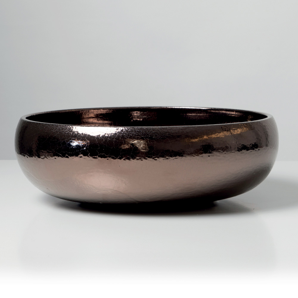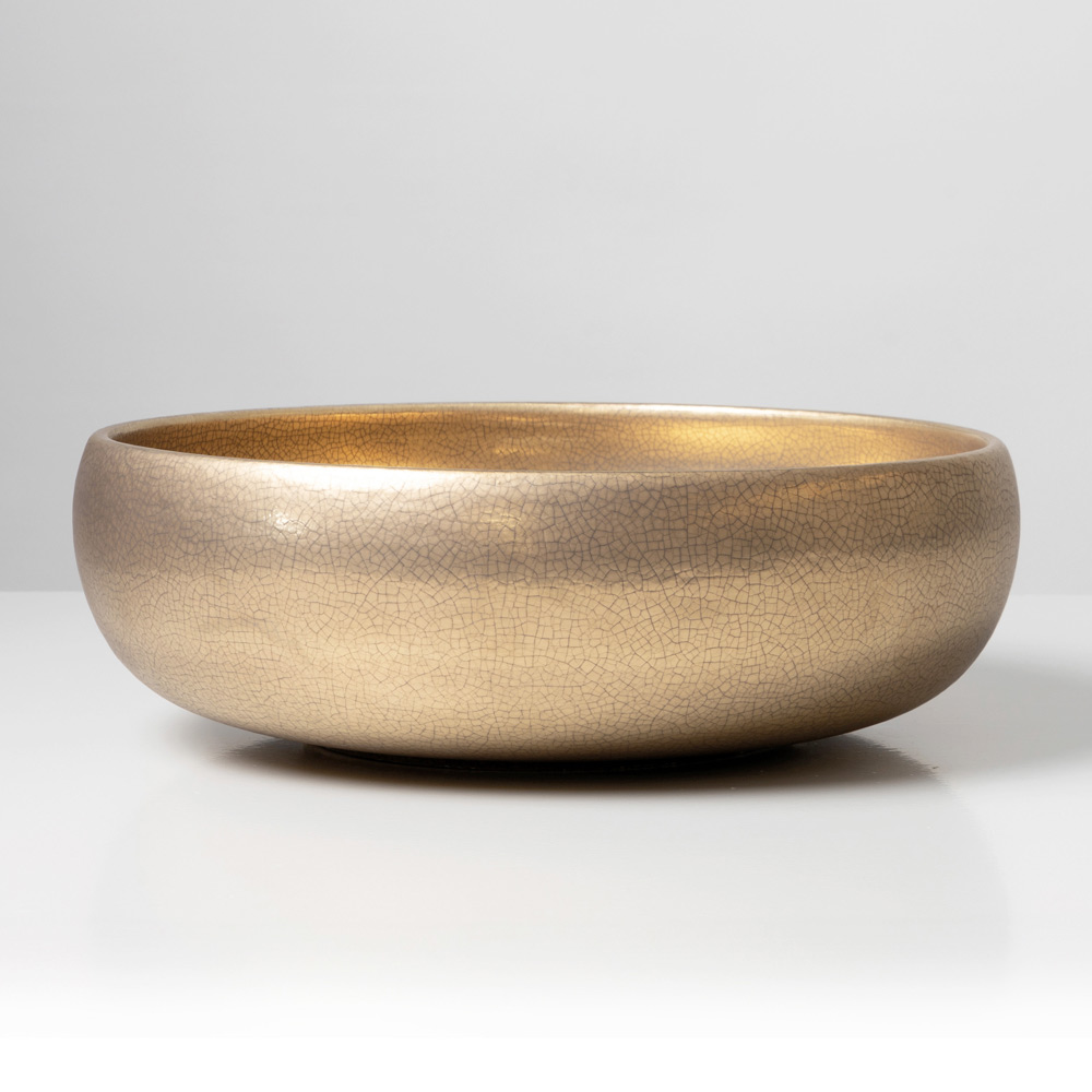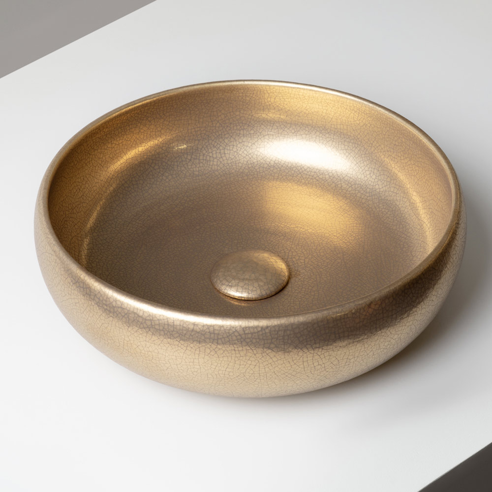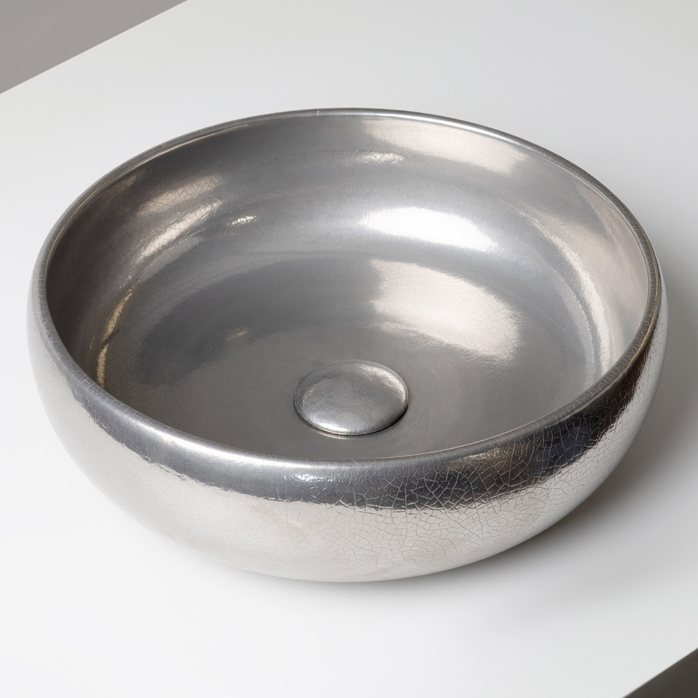 Overfladen er udsmykket med raffinerede metalliske krakelerede overflader , der er påført både indvendigt og udvendigt på vasken. Mikrosprækkerne i emaljen skaber dybe, iriserende refleksioner, der giver produktet et luksuriøst og yderst dekorativt udseende. Hver vask er unik takket være de naturlige variationer, der er skabt af håndværket.