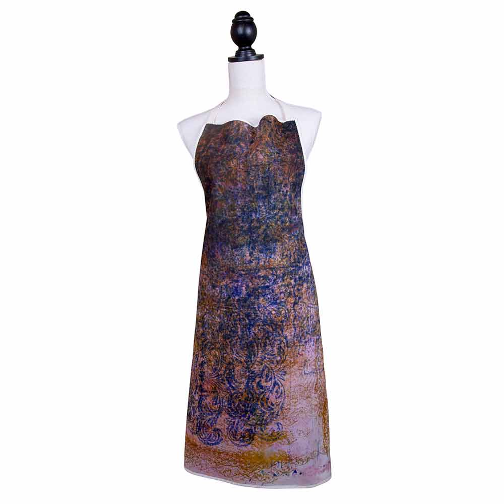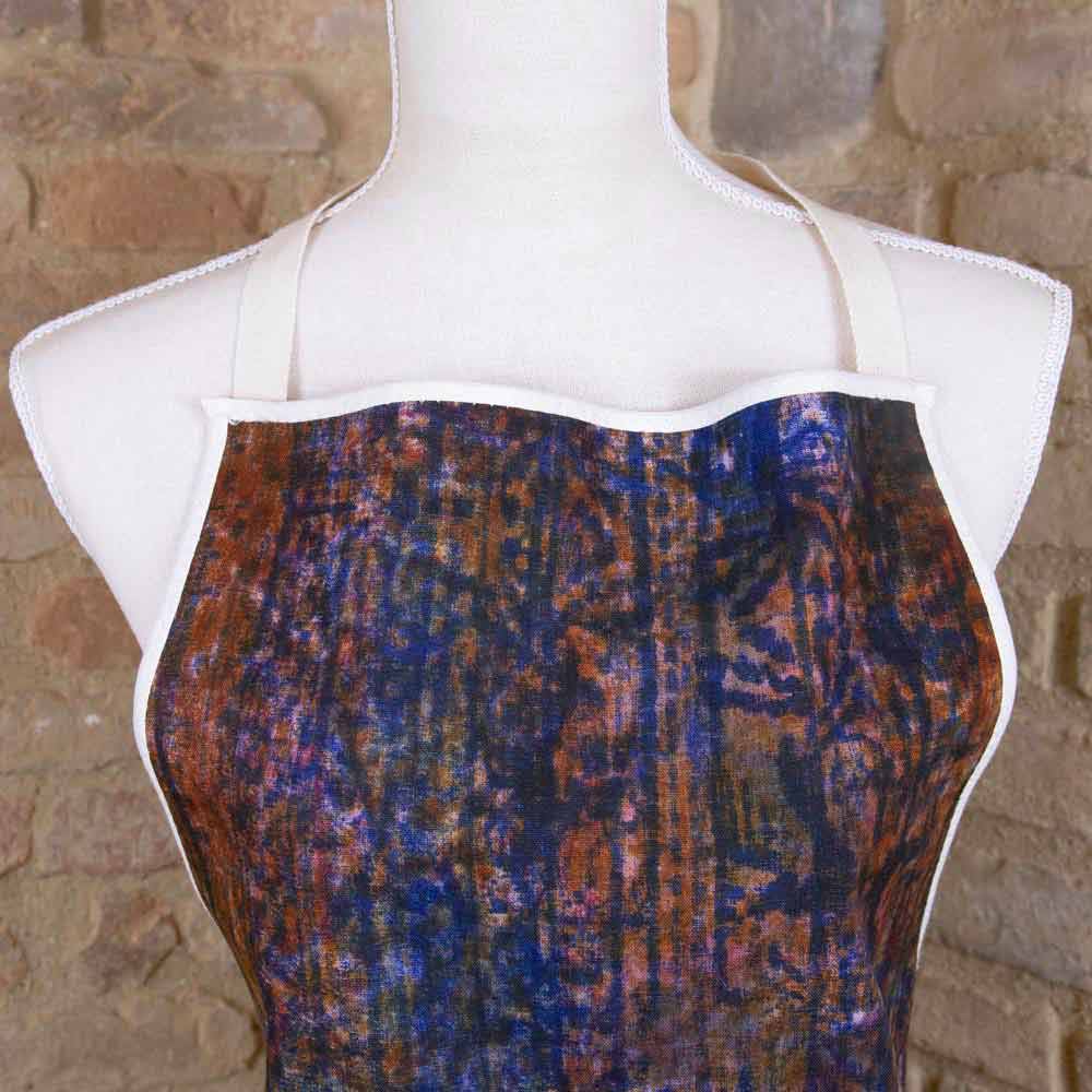 Højt håndværks køkken forklæde med smekke i ren bomuld dekoreret med farvede kunstneriske motiver trykt for hånd, unikt kvalitetsstykke fremstillet i Italien.