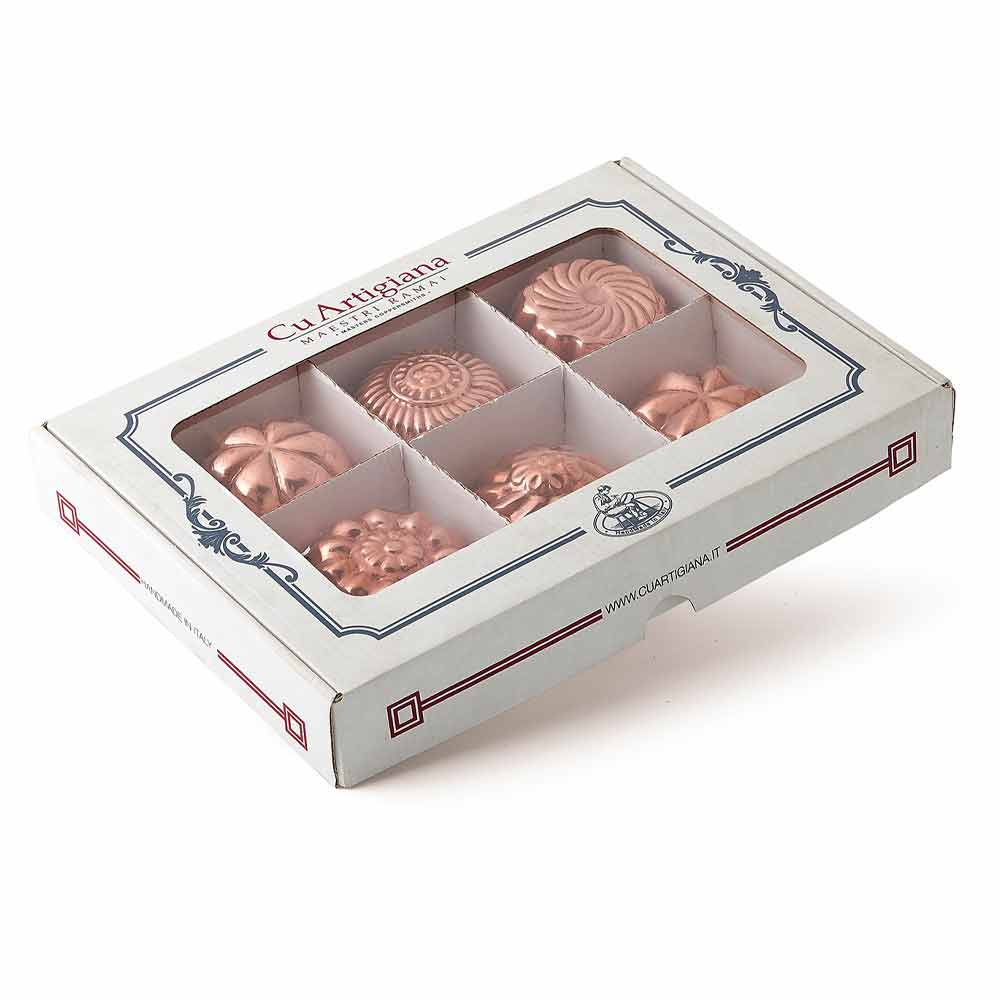 Håndfortinnede kobberkageforme forskellige dekorationer med messingring, 6 stykker lavet i Italien.