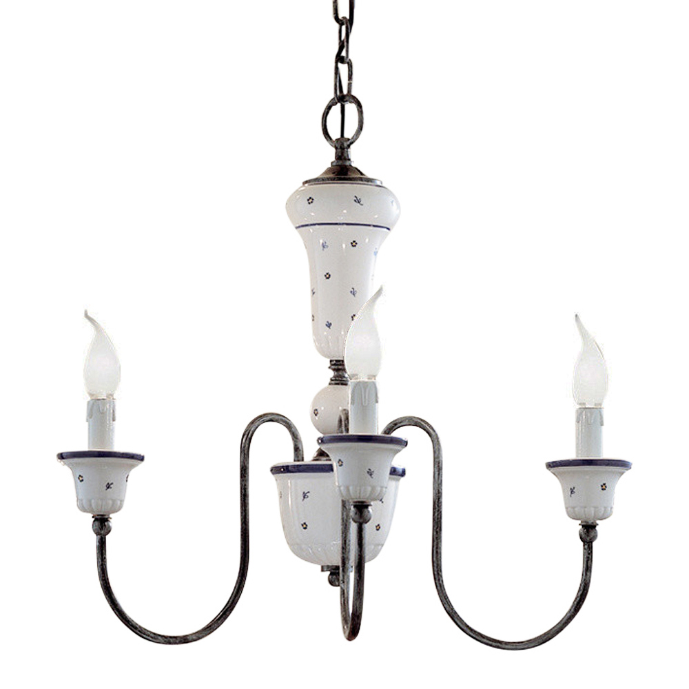 Håndværksmæssig 3-lys lysekrone i messing og håndmalet keramik lavet i Italien af Ferroluce.