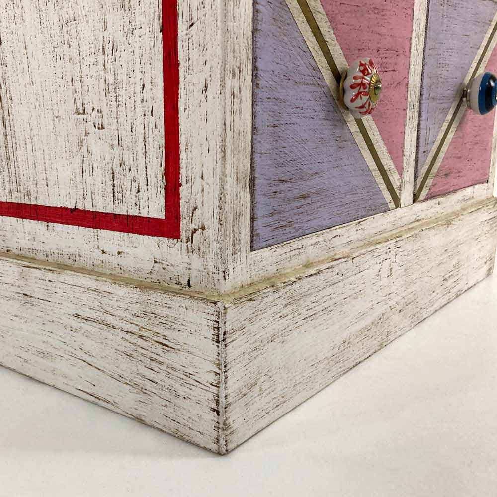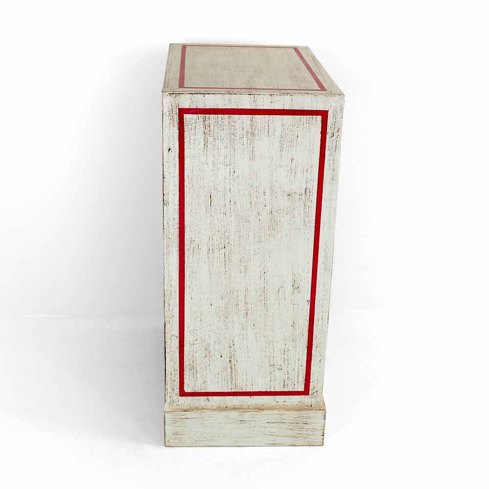 Kommode håndlavet i Italien med struktur i massivt træ og i alderen hvid finish og 6 skuffer i poppelfiner med frontpanel af træ malet i diagonalt mønster og detaljer i antik guld og rød. Produktet er færdig med en gennemsigtig finish, der gør det vandafvisende og fikserer farverne, så de kan ændres over tid.