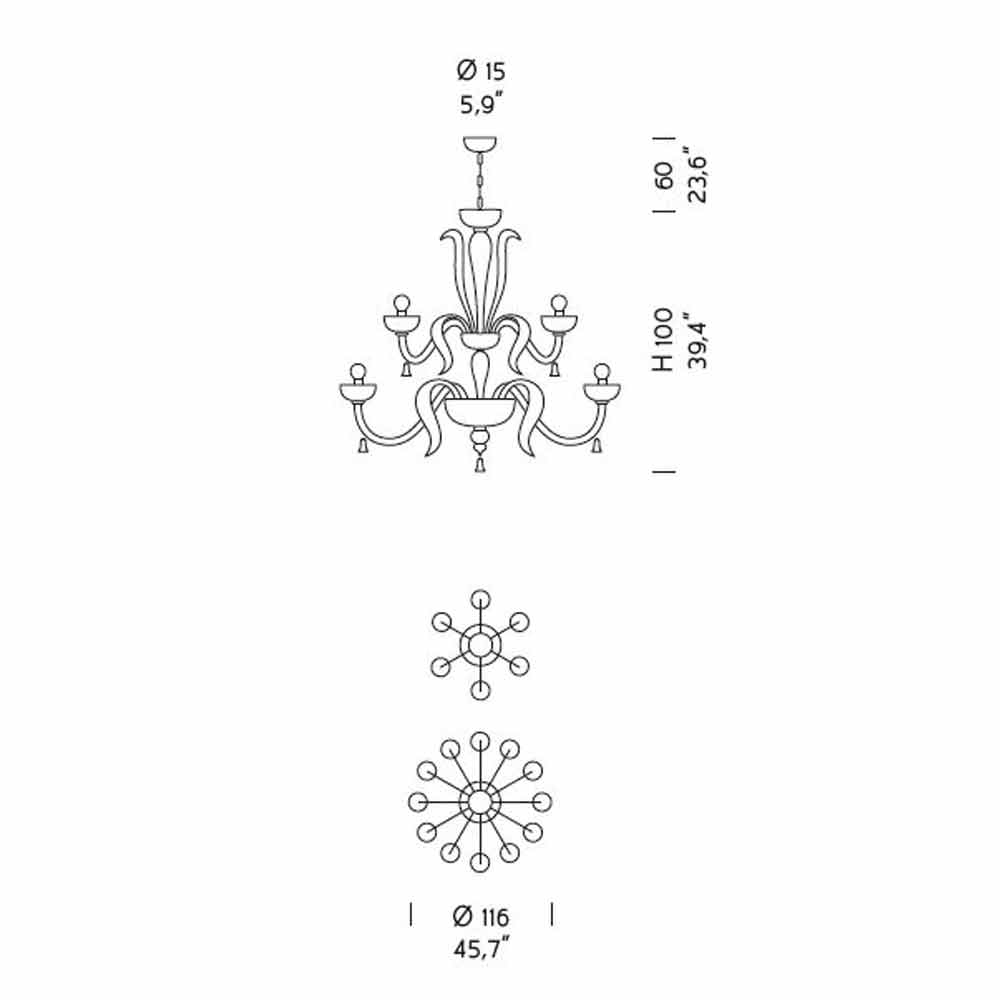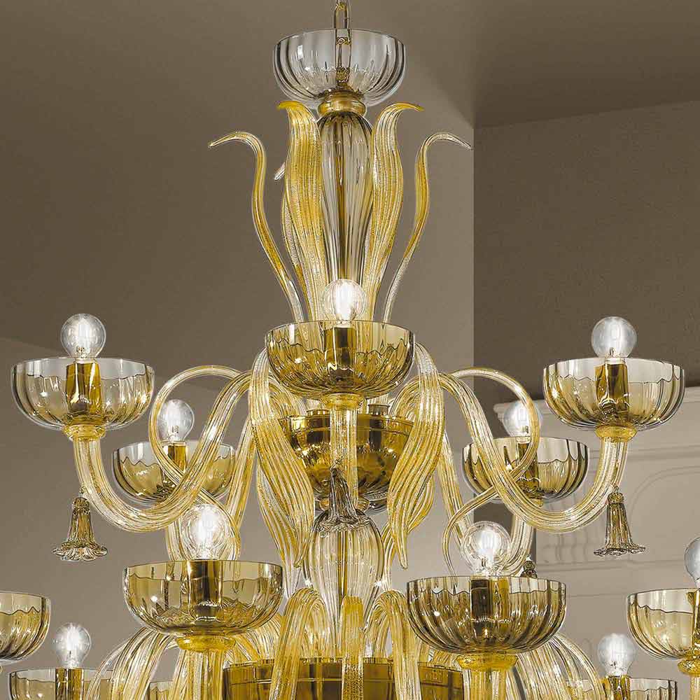 Klassisk lysekrone fremstillet i Italien i Venedig i håndbearbejdet røget finishglas med elementer i 24 karat guld påført varmt under forarbejdning og detaljer i skinnende gyldent metal . Fra en obsessiv opmærksomhed på detaljer og Vertrai-mesternes enorme lidenskab fødes en møbleringsløsning med en imponerende personlighed, der erobrer ethvert rum takket være dens store dimensioner og den vidunderlige kombination af valgte finish. Berøringen af guld øger sin værdi endnu mere og giver liv til et ægte kunstværk .