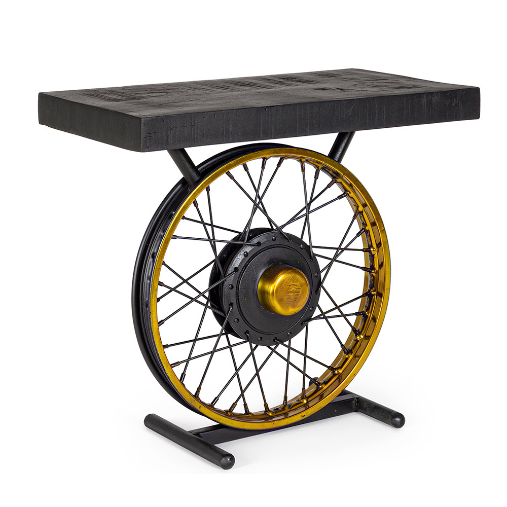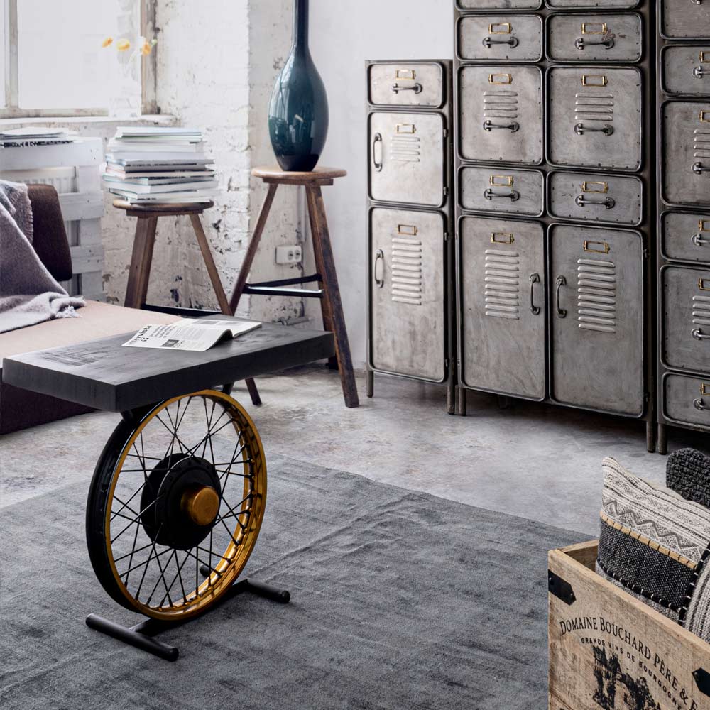 Sofabord til stuen i stål- og mangotræ industrielt design med hjul.