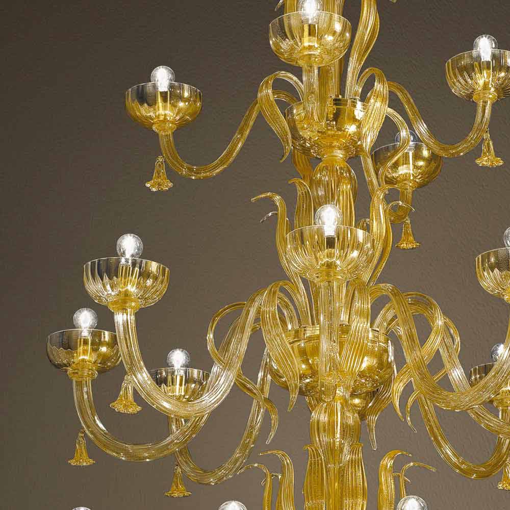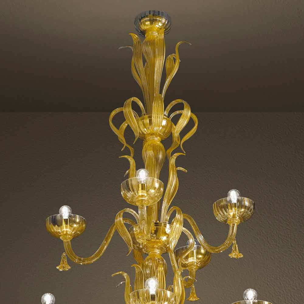 Imponerende og elegant klassisk lysekrone fremstillet i Italien i Venedig i håndlavet glas dækket med 24 karat guld påført varmt under forarbejdning og detaljer i skinnende gyldent metal . Dette vidunderlige møbel er født af brugen af den gamle belægningsteknik, hvis æstetik er baseret på begreber innovation og samtidig minder om fortiden . Sammen med guldets majestæt beriges designet af de tilspidsede arme udsmykket med vedhængsklokker, der er fuldstændigt formet for hånd for et resultat af høj kvalitet og uvurderlig værdi .