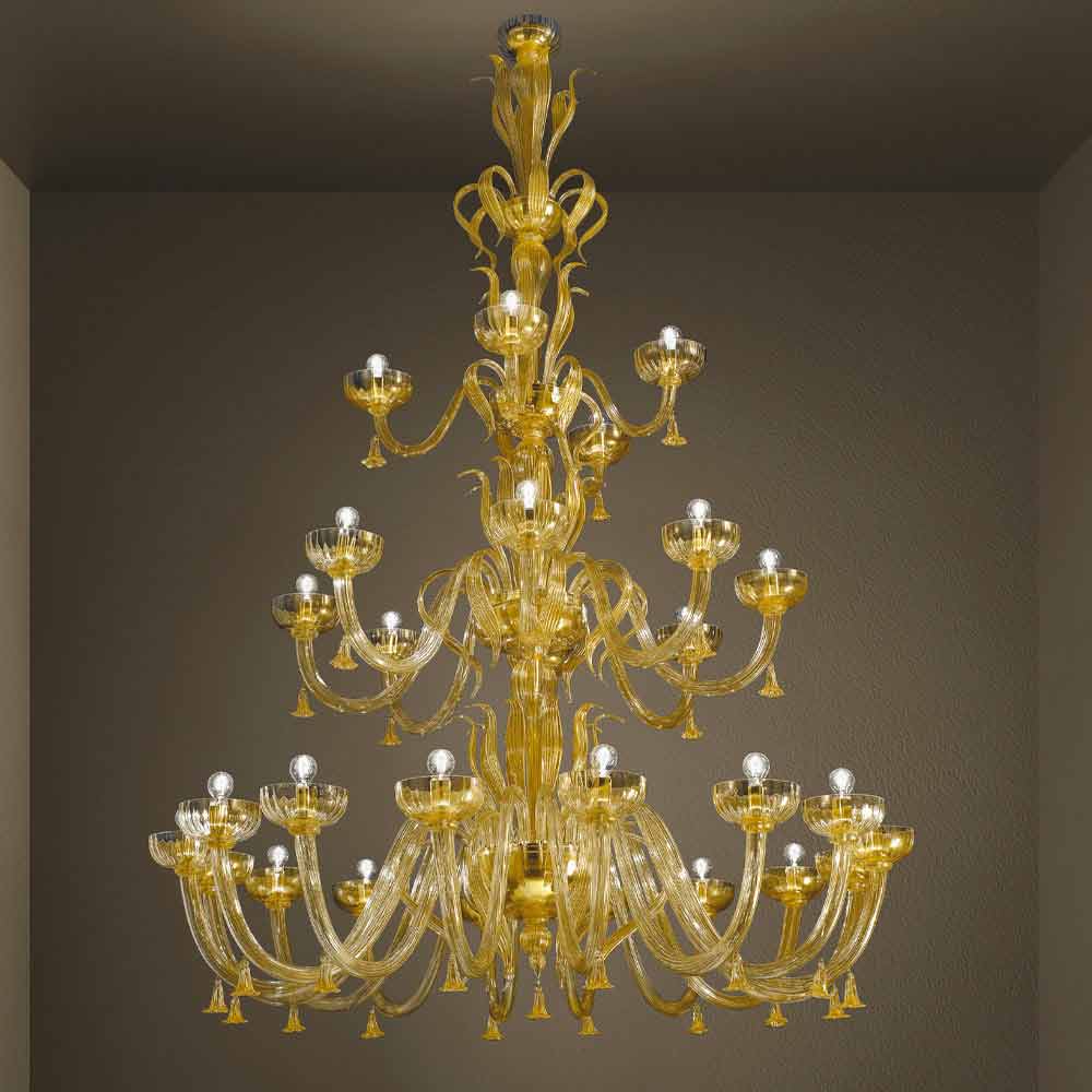 Håndlavet lysekrone med 28 lys i Venedig glas og 24 k guld, fremstillet i Italien.