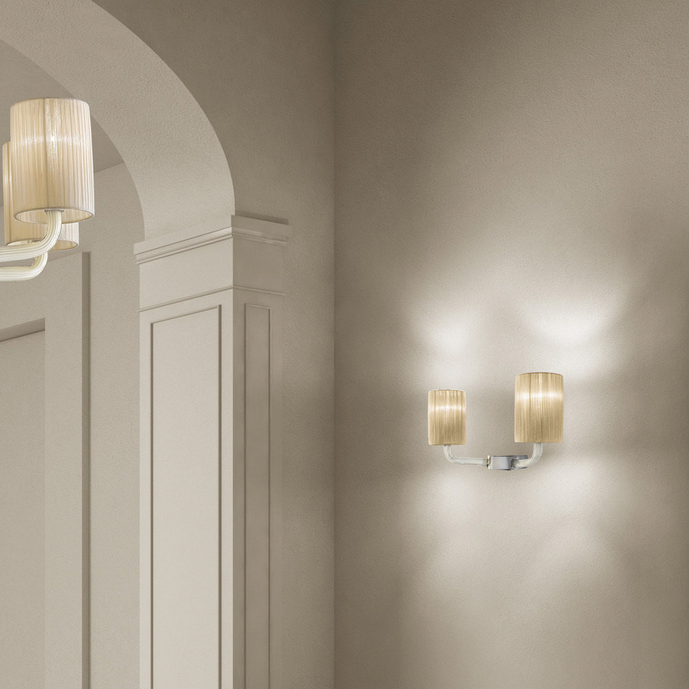 Væglampe i Venedig glas med mælkehvid-elfenben finish håndlavet med metaldetaljer i skinnende krom finish og elegante stof lampeskærme . Et møbel karakteriseret ved et artikuleret, men essentielt design , der er i stand til at berige miljøet og give karakter takket være dets stærke scenetilstedeværelse, der er typisk for fortidens klassiske lysekroner. De rørformede glasarme understøtter på en delikat og stilfuld måde de vidunderlige stoflampeskærme, som hjælper med at bære lyset i alle retninger for en varm , blød og omsluttende belysning.