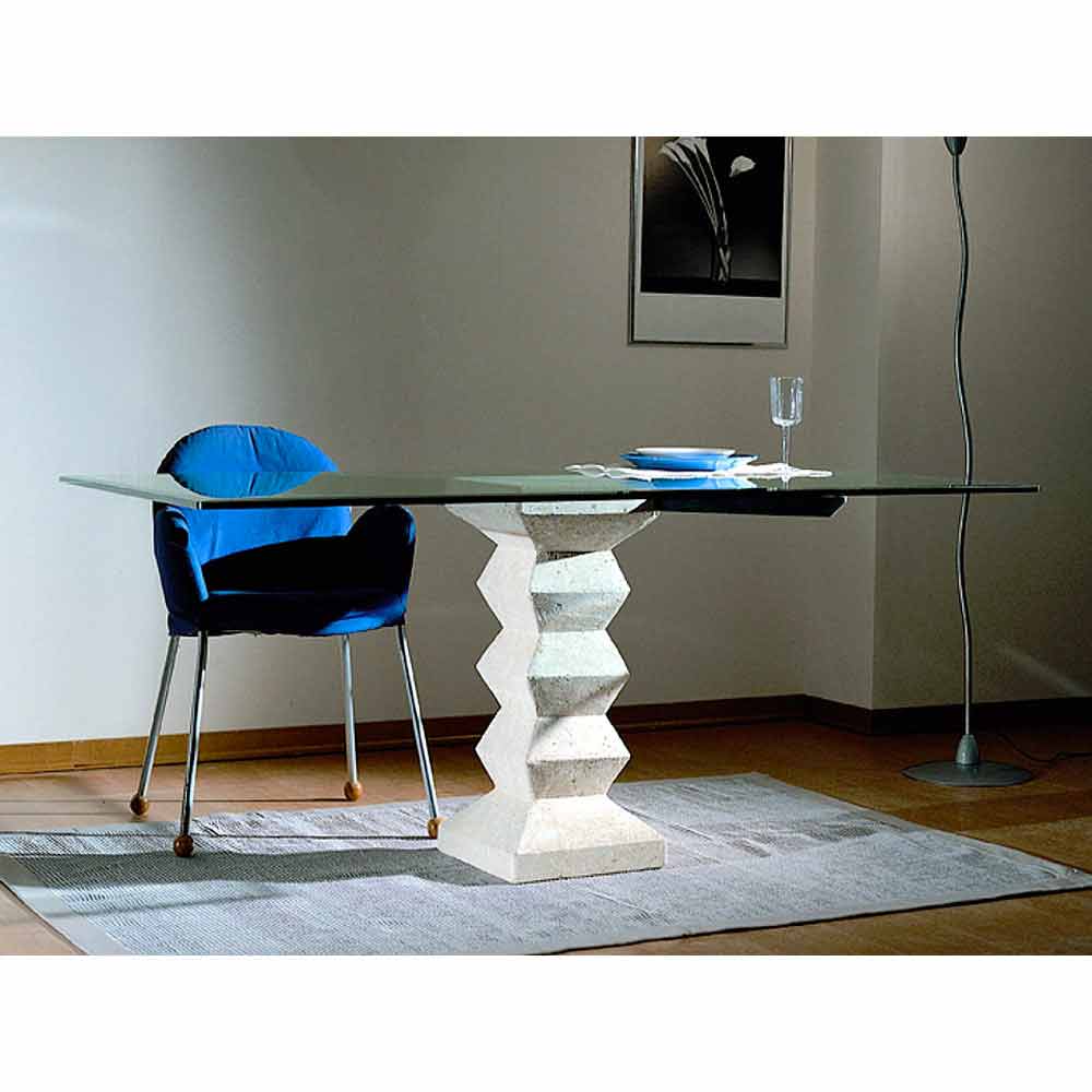 Moderne rektangulært spisebord Fremstillet i Italien med central base i naturlig Vicenza sten , håndskåret af den massive blok og med 15 mm tykt floatglasplade, understøttet af en børstet og lakeret råmetalbjælke.