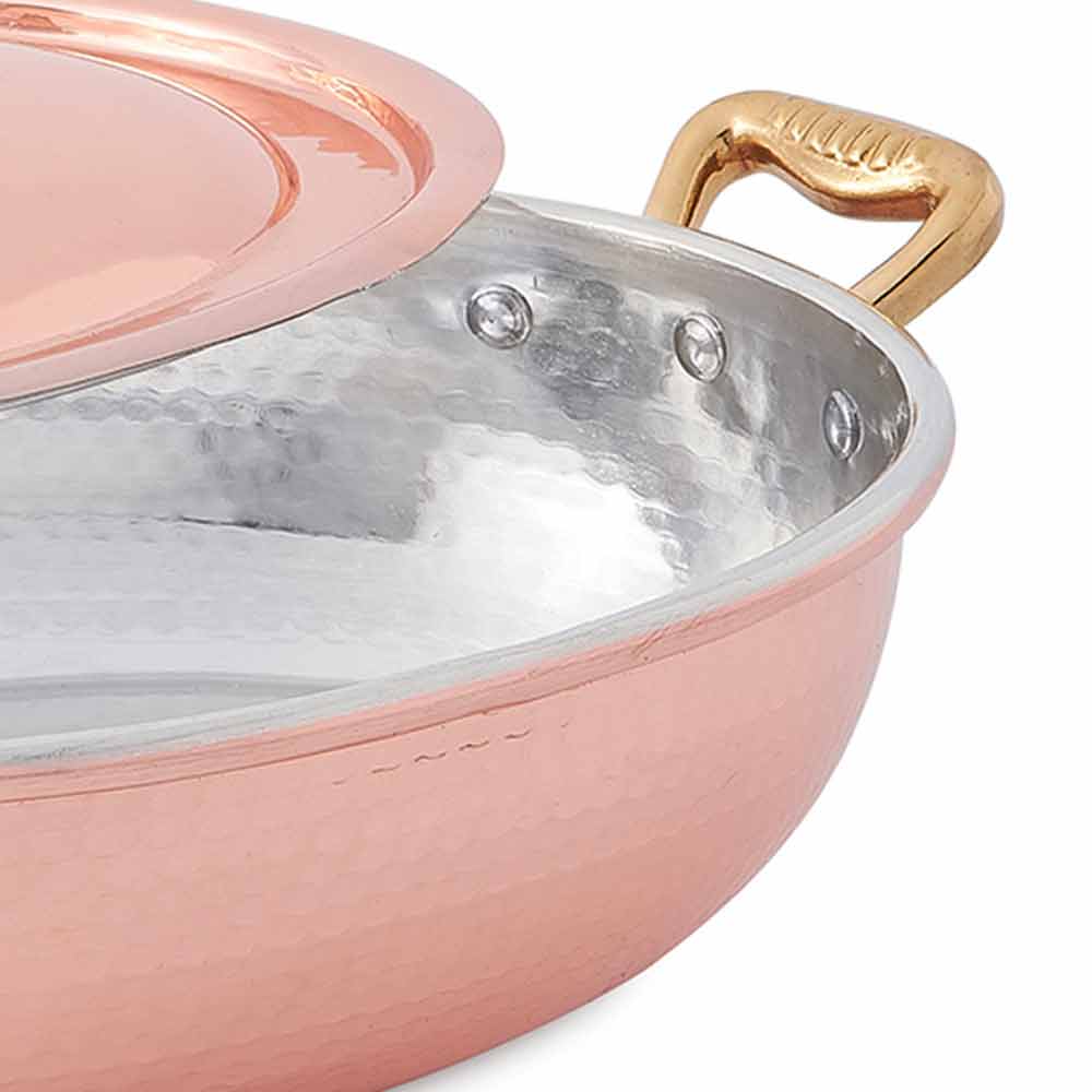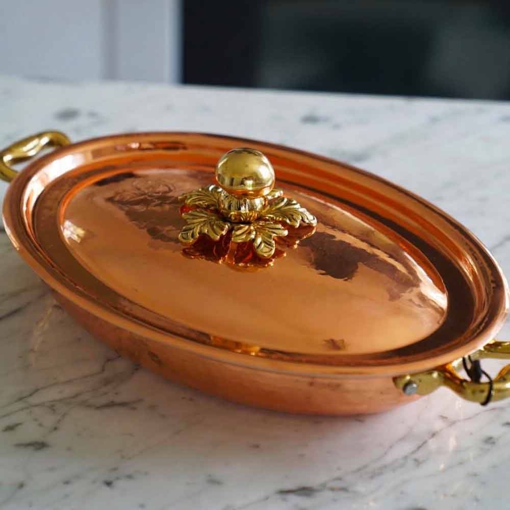 Oval gryde med låg, håndfortinnet kobberværk med greb af messing fremstillet i Italien.