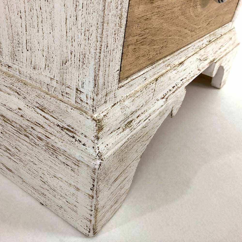 Kommode i massivt træ og håndlavet i Italien i alderen hvid finish. De 4 skuffer har en 10 mm poppel krydsfiner struktur for at holde mere plads inde i dem, mens frontpanelet er i 18 mm træ og suppleres med specielle håndmalede keramiske drejeknapper. De vidunderlige farver, der beriger skufferne, opnås takket være brugen af naturlige arealer aggregeret med lim af animalsk oprindelse, materialer valgt som et alternativ til almindelig industriel maling. Dette valg af konstruktion betyder, at hver artikel kan minimere tilstedeværelsen af formaldehyd, et skadeligt stof klassificeret som kræftfremkaldende. Kommoden er endelig afsluttet med en gennemsigtig finish, der gør den vandafvisende og fikser farverne for at gøre dem uforanderlige over tid.