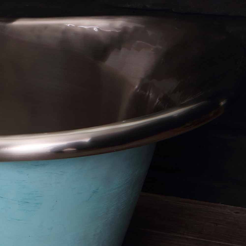Bordvask til badeværelset fuldstændigt lavet af kobber, med indvendig finish i satin nikkel og udvendig finish i verdigris, helt håndlavet. Håndvask i vintage stil, der kombinerer skønhed og elegance, giver et strejf af klasse til dit hjem!