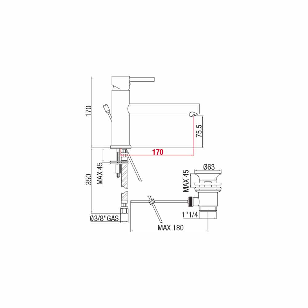 Made in Italy badeværelse vask mixer i forkromet messing med tud 170 mm centerafstand og 1 '' 1/4 afløb komplet med åben Ø 25 mm Kerox patron.