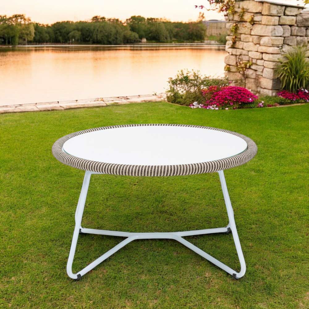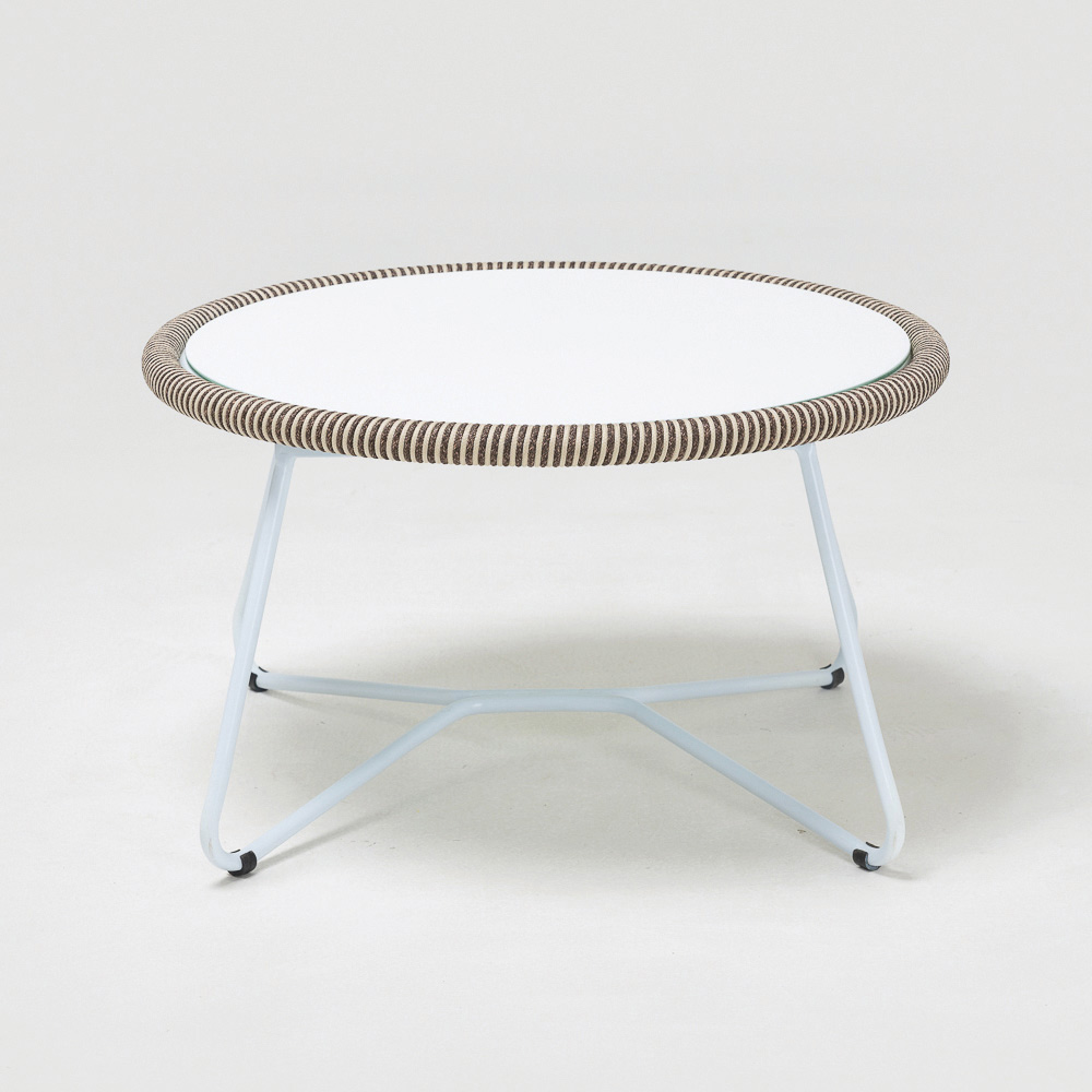 Dette havebord er indbegrebet af design, der møder funktionalitet i sin reneste og mest stilistisk raffinerede form. Den runde top er dygtigt vævet, hvilket skaber en suggestiv visuel effekt, der tiltrækker øjet og inviterer til berøring. Den malede aluminiumsbase giver bordet en næsten æterisk lethed, samtidig med at den sikrer stabilitet og modstandsdygtighed over for udendørs forhold.