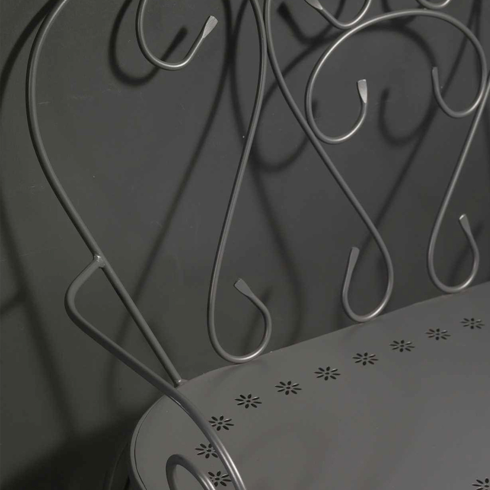 Bænken er lavet af vejrbestandigt metal, ideelt til at nyde øjeblikke af afslapning i haven, på terrassen eller i et hyggeligt hjørne af din gårdhave. Opmærksomheden på detaljer og finish gør denne bænk alsidig og velegnet til forskellige dekorative stilarter, fra den mest klassiske og romantiske til den moderne og minimalistiske.
