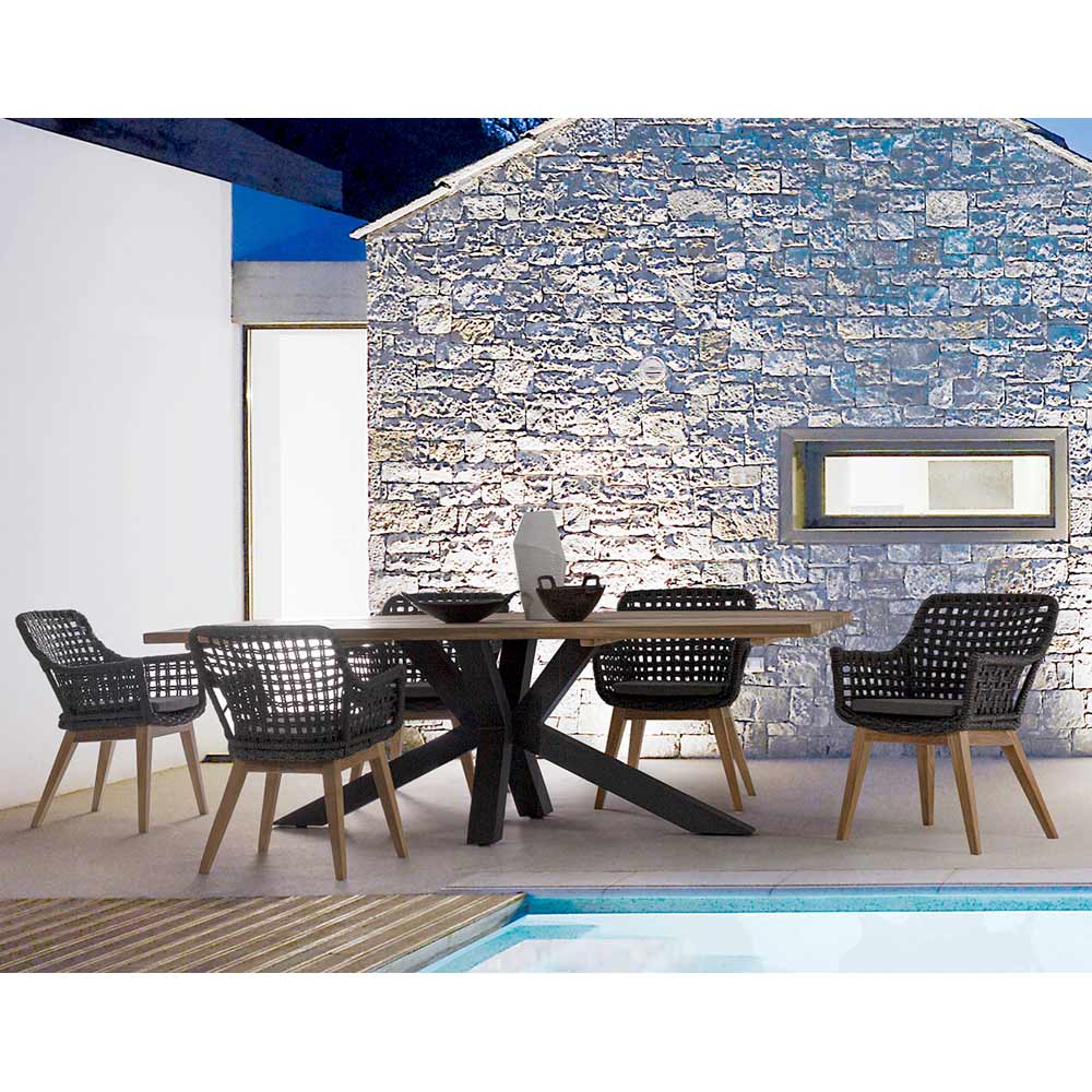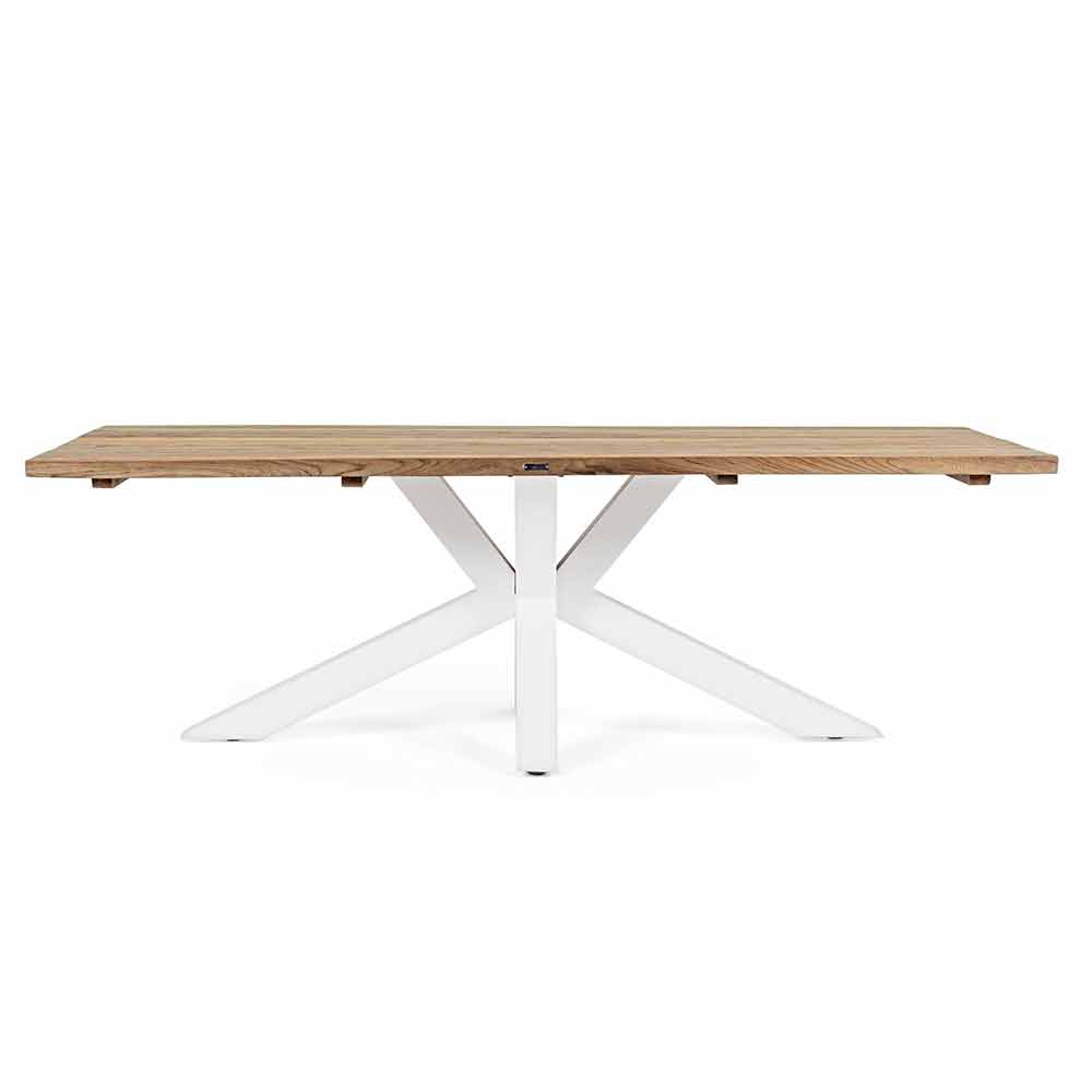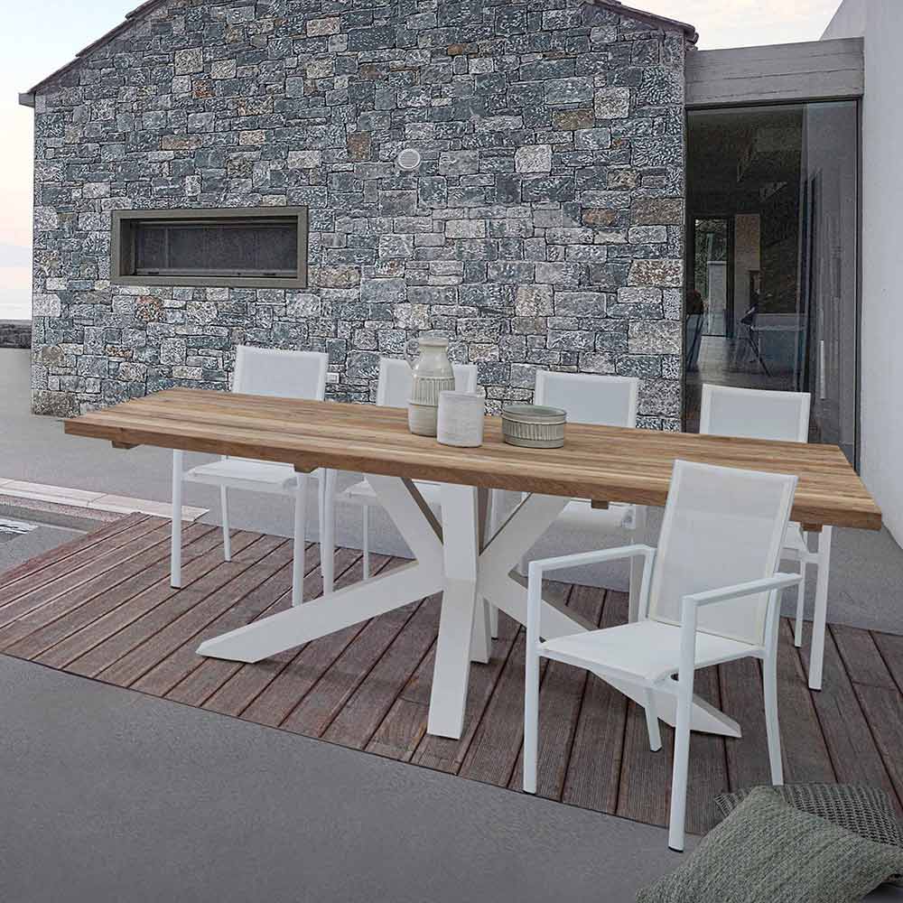 Moderne udendørs bord med hvide eller sorte ben i aluminium og teaktræ til 10 personer.