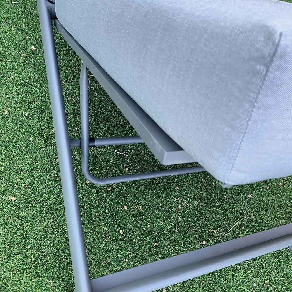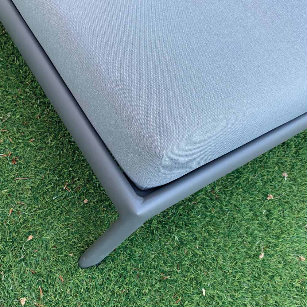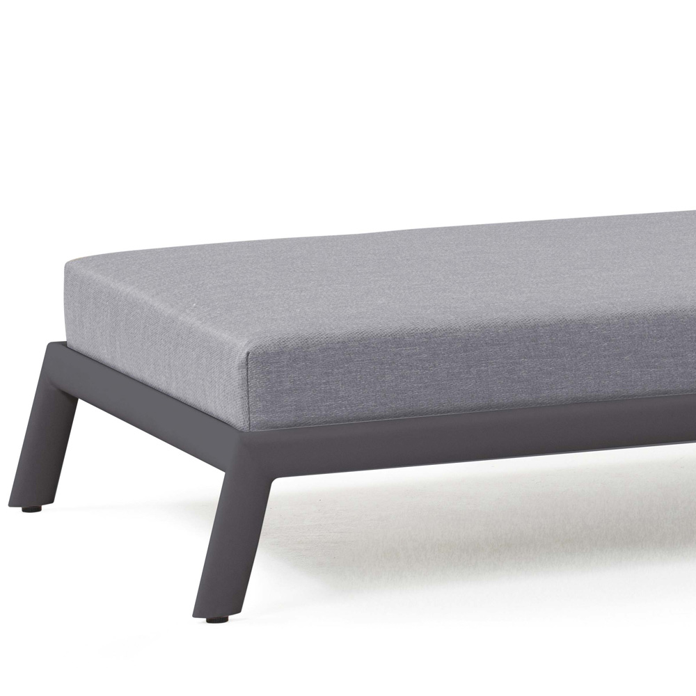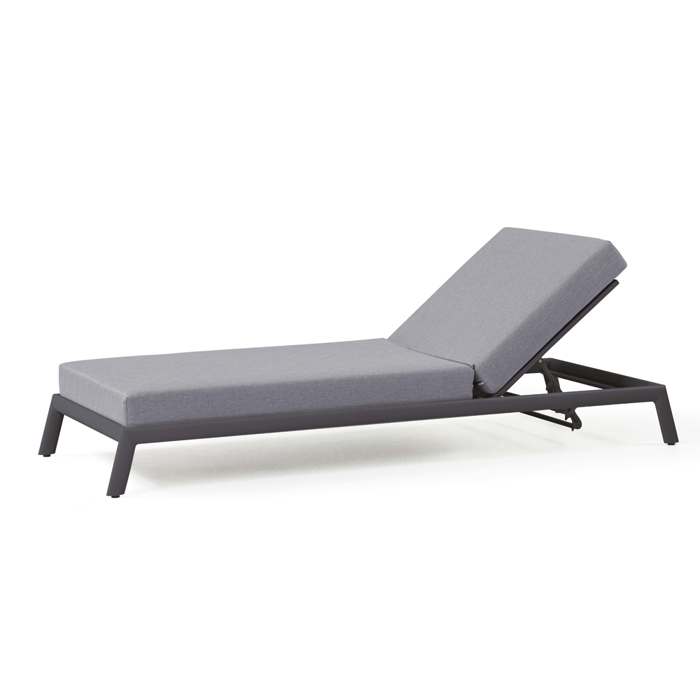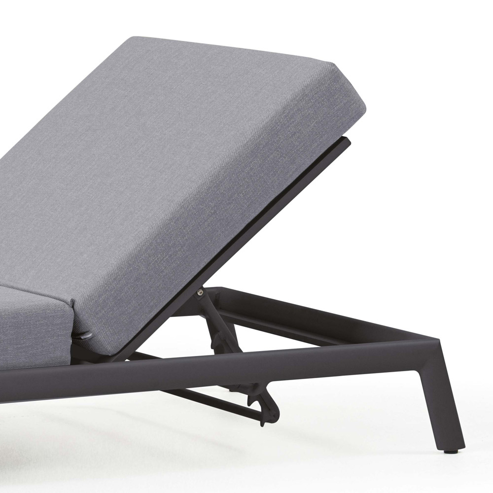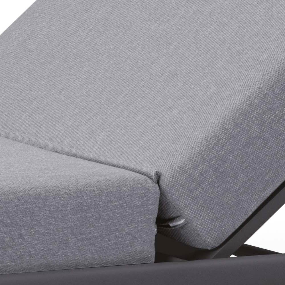 Havechaiselong med indvendig struktur i antracitmalet aluminium med hurtigtørrende skumdrænende gummi og himmelgråt paraplystofbetræk.