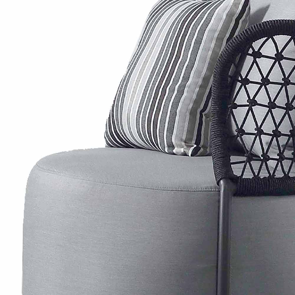 Udendørs lænestol i gråt stof med mesh og aluminiumsstruktur.