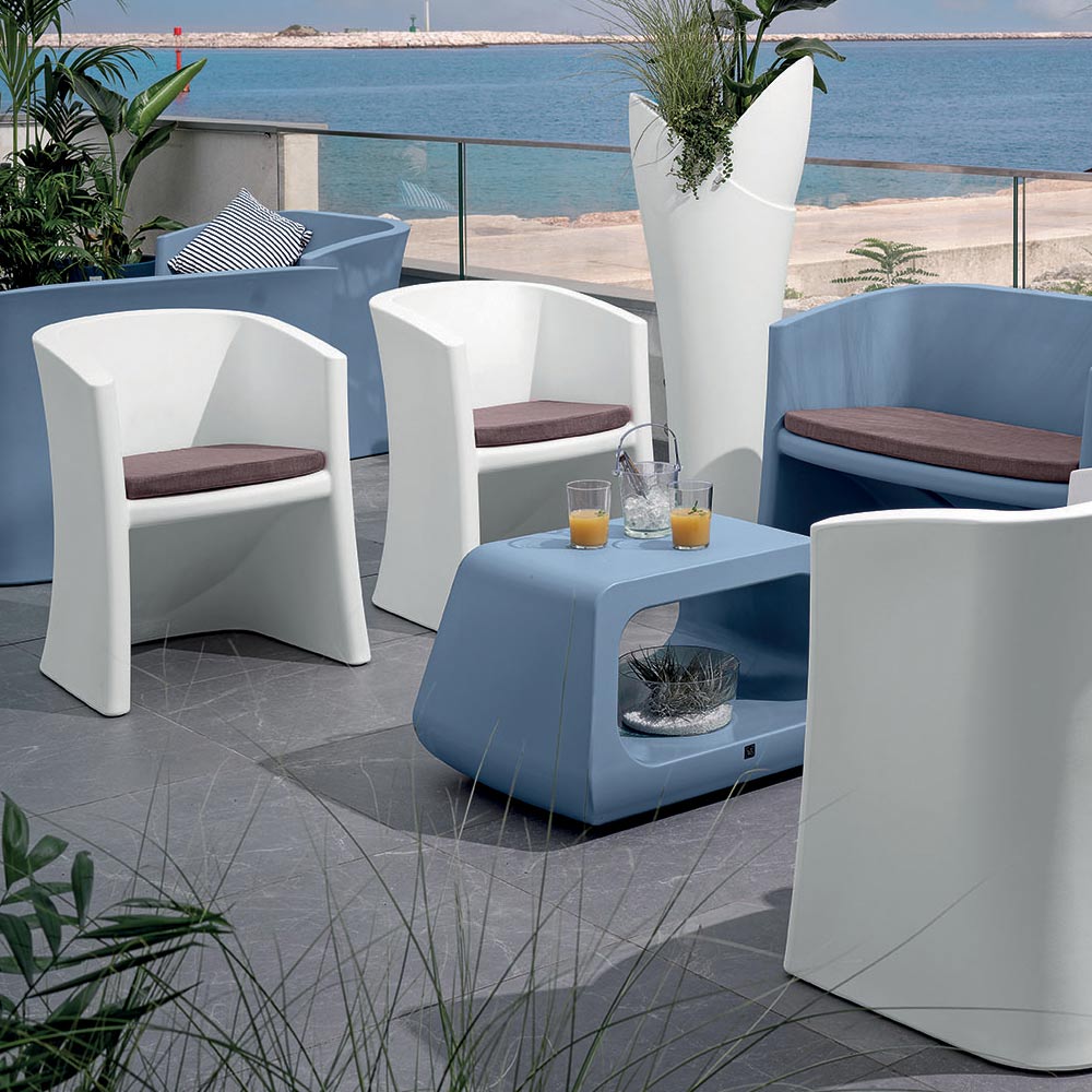Denne udendørs lænestol helt lavet i Italien med en farvet polyethylenstruktur er designet til dem, der søger praktisk og design på samme tid for en næsten omsluttende komfort.