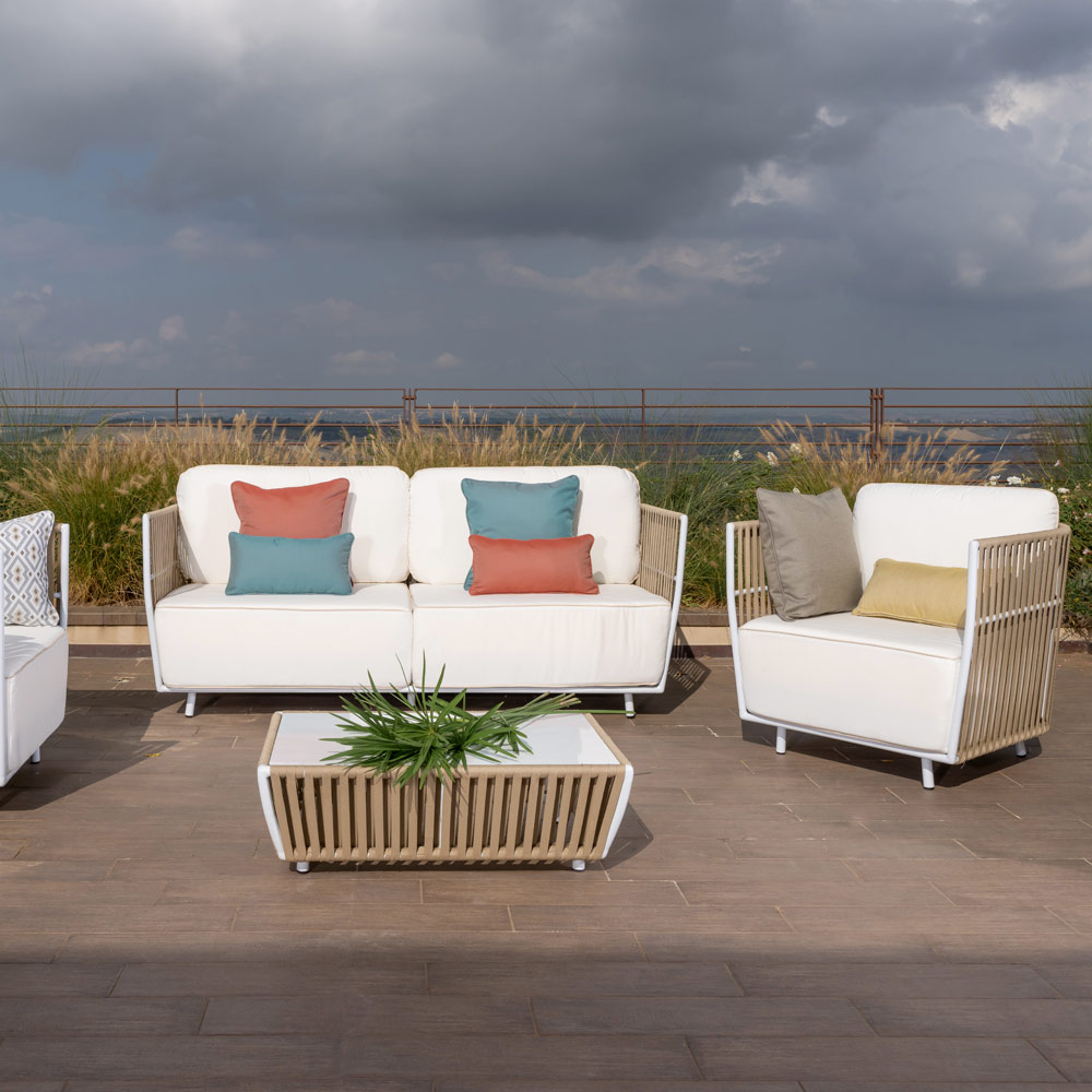 Takket være brugen af særlige materialer af høj kvalitet garanterer denne udendørs lounge udmærket modstandsdygtighed over for vejr, snavs, støv og pletter.