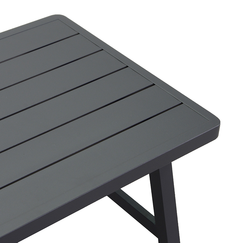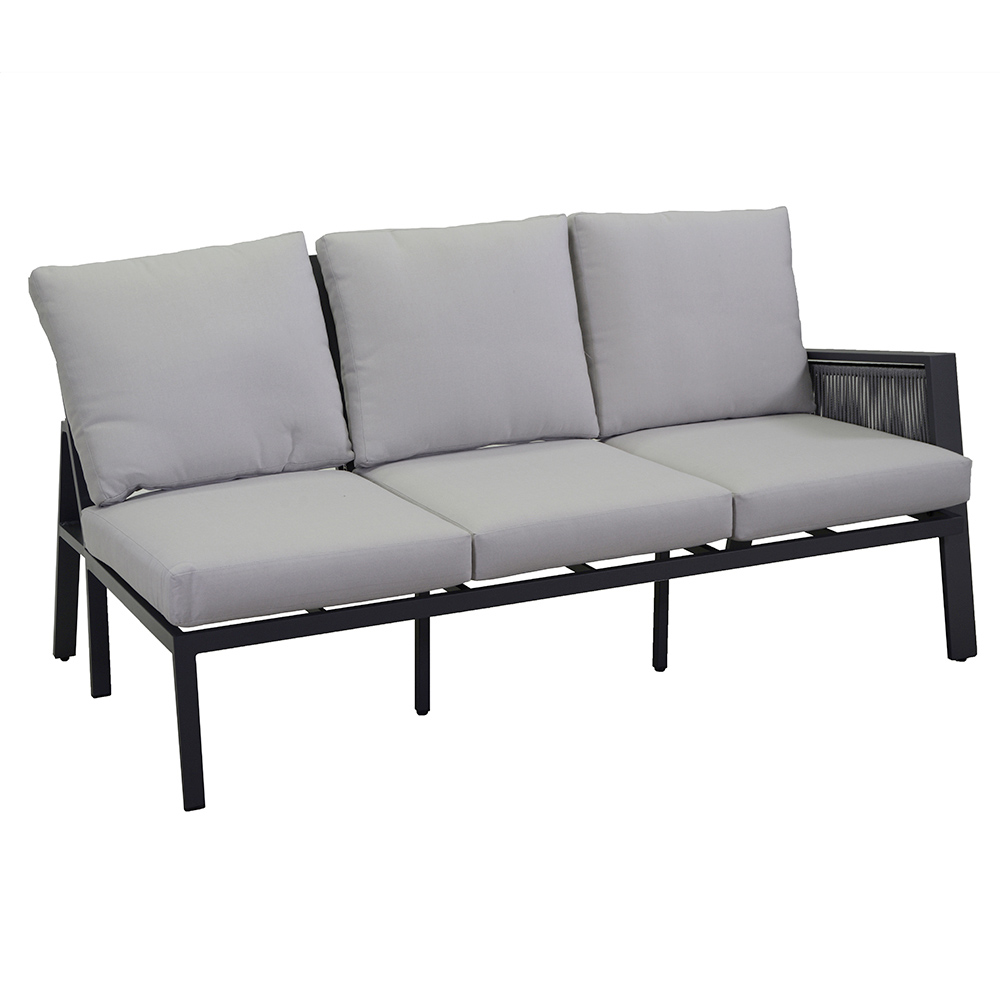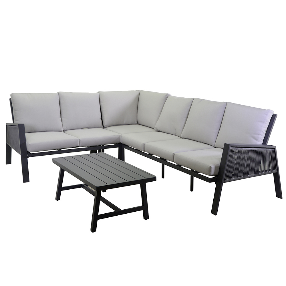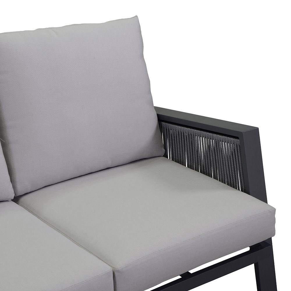 De lysegrå vandafvisende 100 % olefinhynder, der er aftagelige og nemme at vedligeholde, garanterer maksimal komfort til lange perioder med afslapning i det fri. Komplet med et bord med aluminiumsplade er denne stue ikke kun praktisk, men også æstetisk tiltalende, idet den kombinerer funktionalitet og stil i en enkelt udendørs møbelløsning.