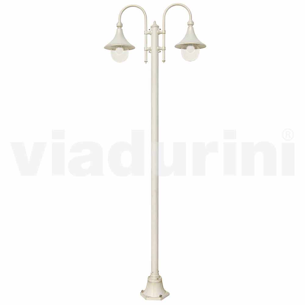 Anusca er en majestætisk to-lys udendørs lygtepæl håndlavet i Italien med materiale af høj kvalitet: trykstøbt aluminiumsstruktur og polycarbonat diffuser tilgængelig i følgende varianter: transparent (garanterer optimal og altid homogen lysspredning); opal og røget.