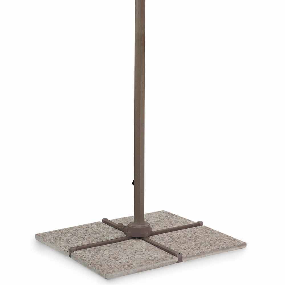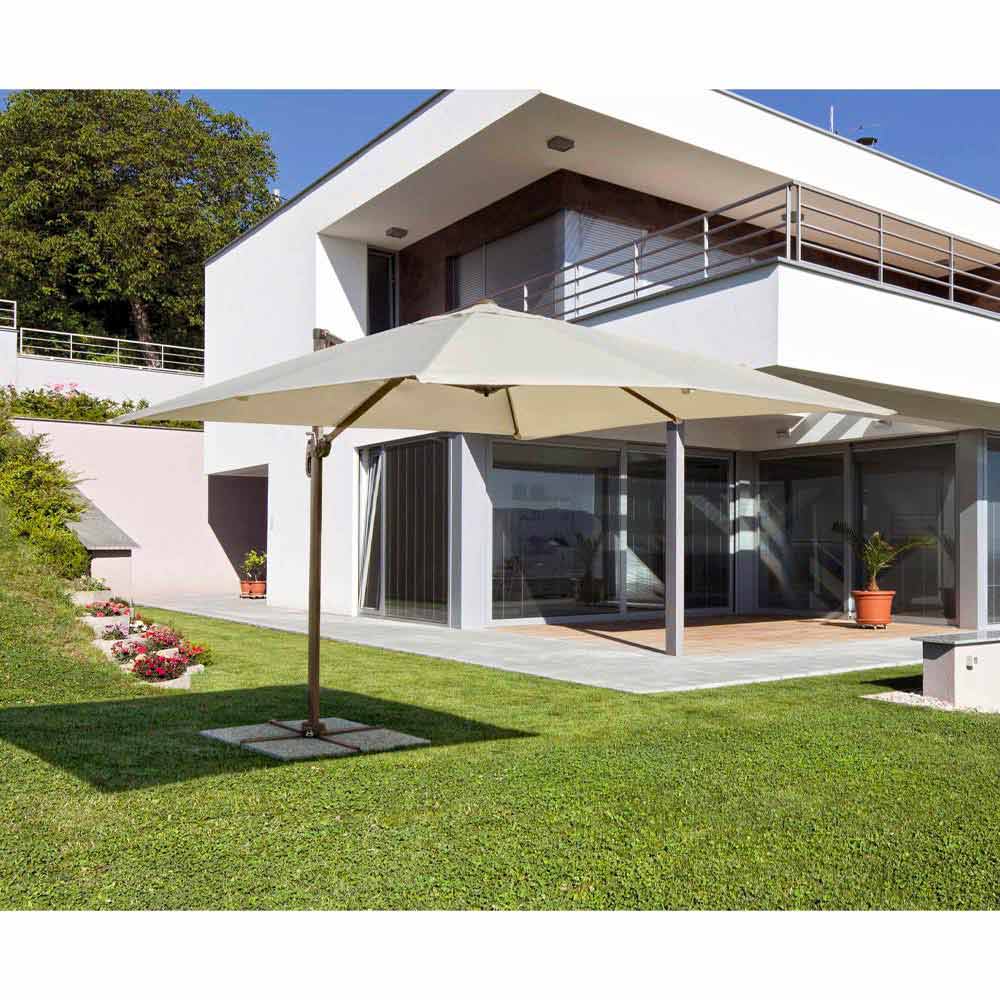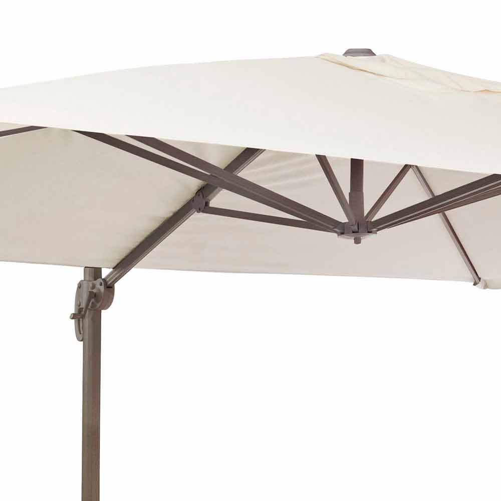Pulverlakeret aluminiumsstruktur (polyester). 53x77mm stang, 25x40mm ophængt stang, 8 14x24mm ribben. Naturligt polyesterstof 200gr / m2 med pa (polyamid) belægning. Tværfod i stål . Manuelt drejelig 360 ° pol.