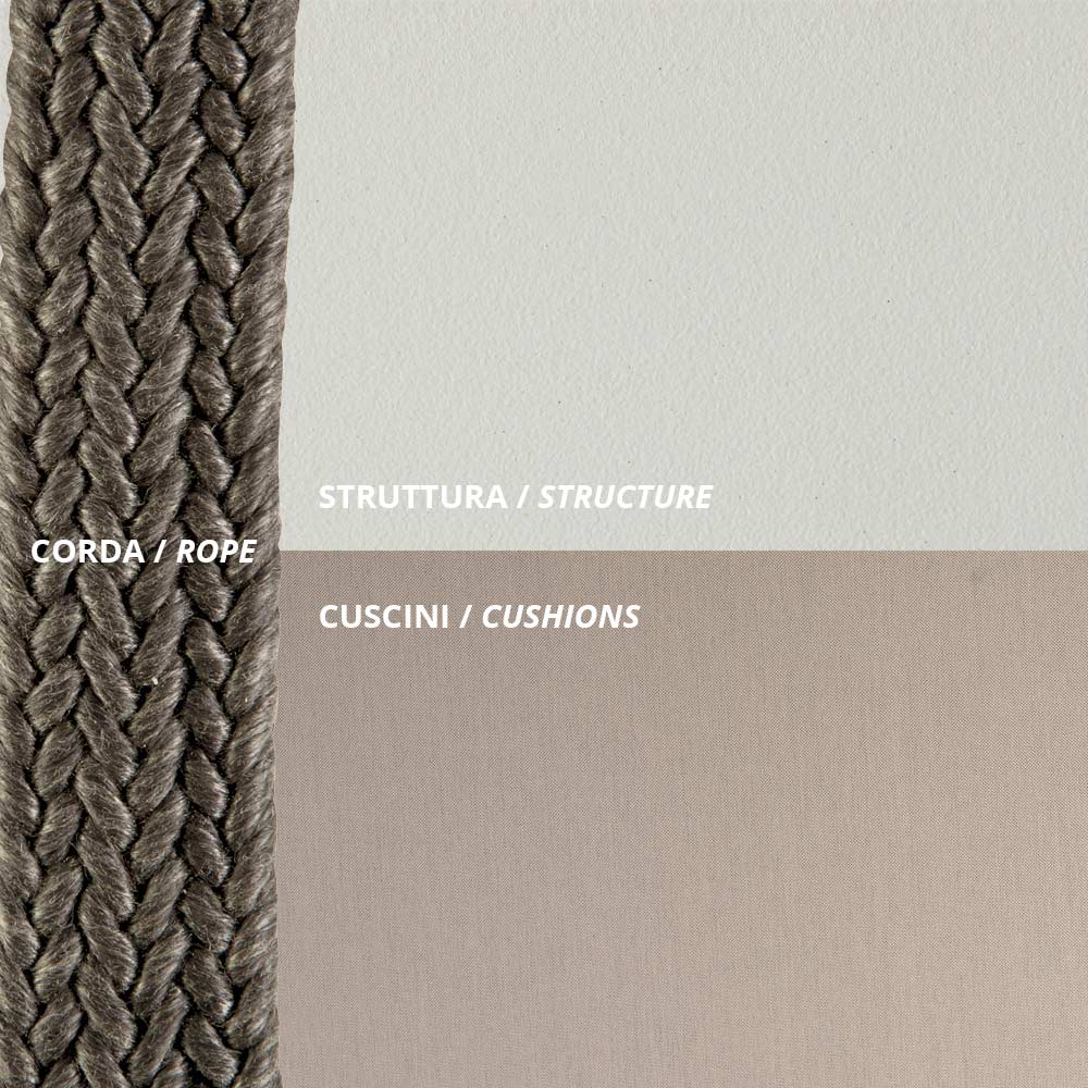 Udendørsmøbelpuf i galvaniseret stål og reb , fremstillet i Italien, inklusive sædehynde . Galvaniseringen giver en større modstandsdygtighed over for ætsende atmosfæriske stoffer, mens rebet er modstandsdygtigt over for klor og solstråler samt anti-skimmel. Hynden er lavet af et materiale, der er modstandsdygtigt over for UV-stråler og vand, og som bevarer farven i lang tid, hvilket gør gyngen til et perfekt element til ethvert udendørsmiljø.