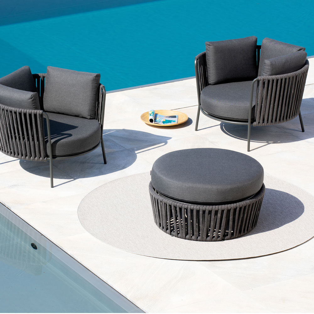 Det moderne design og sammenvævningen af grundlæggende geometriske former skaber en dynamisk og funktionel atmosfære . Med dette møbel vil enhver udendørs stue blive opfattet som et flydende rum , der integreres perfekt i enhver type udendørs rum.